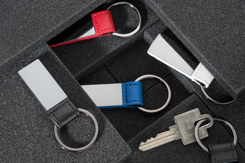 Elegancki dwustronny brelok wykonany z materiału skóropodobnego PU i metalu w kolorze grafitowym. Logo wygrawerujemy na metalowej blaszce.