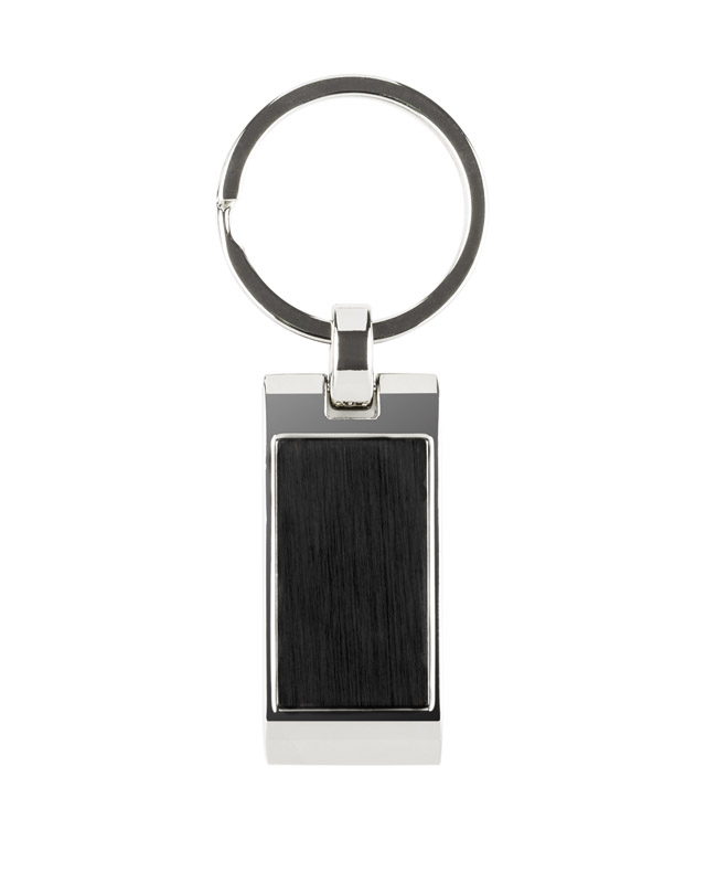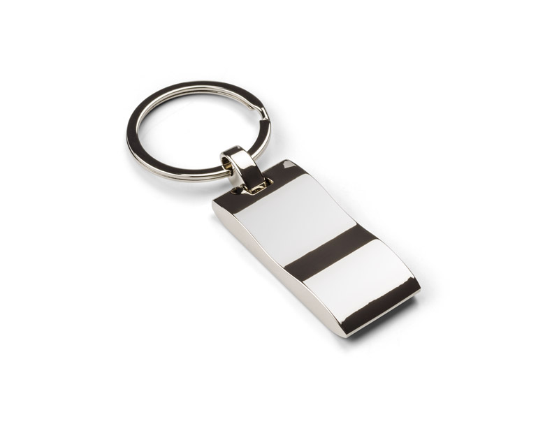 Metalowy brelok do kluczy z prostokątną, falowaną zawieszką. Logo grawerujemy na powierzchni breloka.