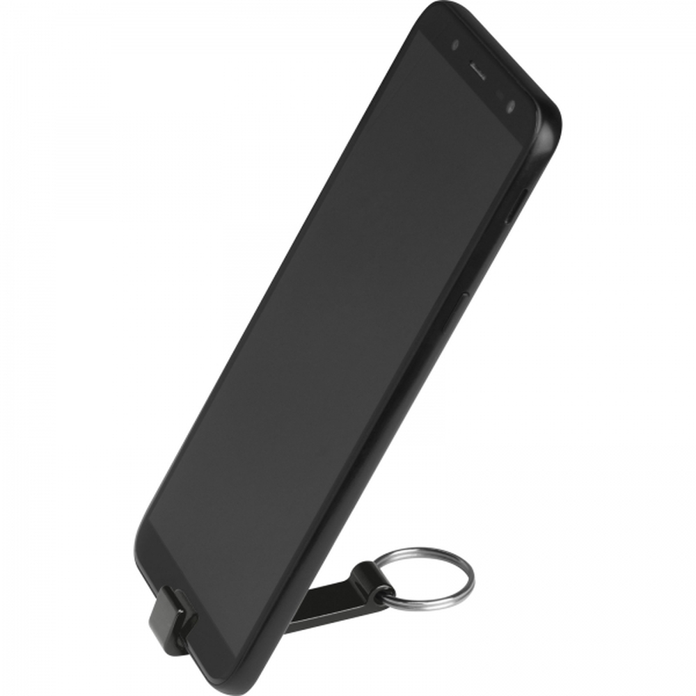 Metalowy brelok z otwieraczem do butelek, którego można użyć również jako stojaka na telefon.