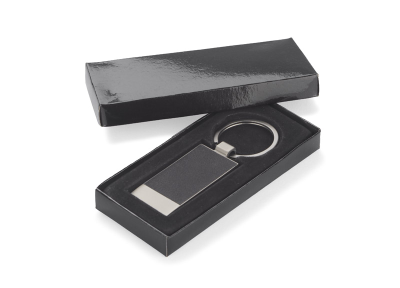 Metalowy brelok do kluczy z przyjemnym w dotyku materiałem. Pakowany w kartonik.