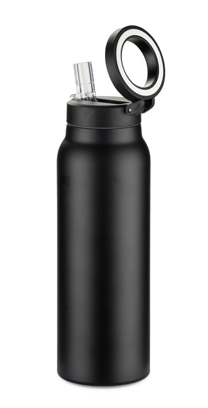 Metalowa butelka termiczna MAGHOLD o pojemności 700 ml posiada podwójną ściankę z izolacją próżniową, która utrzymuje temperaturę napojów do 8 godzin. Wyposażona w pokrywkę typu straw lid ze zintegrowaną słomką i mechanizmem otwierania „podnieś”, pozwala wygodnie pić w ruchu. Składany, magnetyczny uchwyt pełni funkcję rączki do przenoszenia, a także umożliwia przymocowanie butelki do metalowej powierzchni lub wykorzystanie go jako stojaka do telefonu.