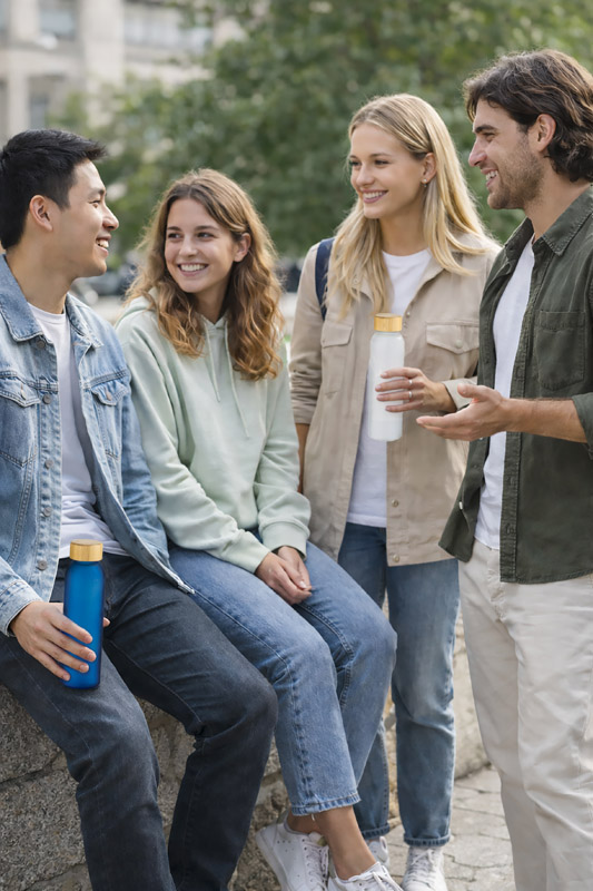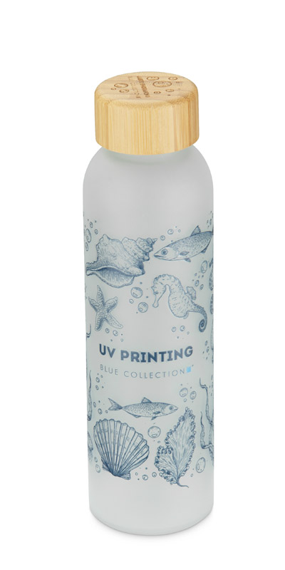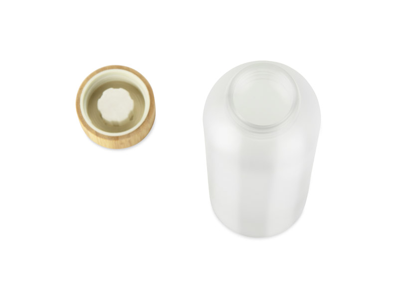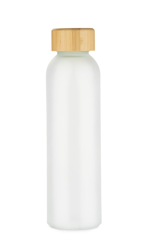 Butelka NILLO o pojemności 500 ml została wykonana z matowego szkła pochodzącego z recyklingu. Jej półprzezroczysta powierzchnia i bambusowa zakrętka nadają całości nowoczesny, stonowany wygląd. Klasyczna, gwintowana zakrętka zapewnia szczelne zamknięcie, a prosta forma sprawia, że butelka jest wygodna w codziennym użytkowaniu. Doskonale sprawdzi się do przechowywania wody, soków lub naparów. To elegancki gadżet wielokrotnego użytku z możliwością znakowania.