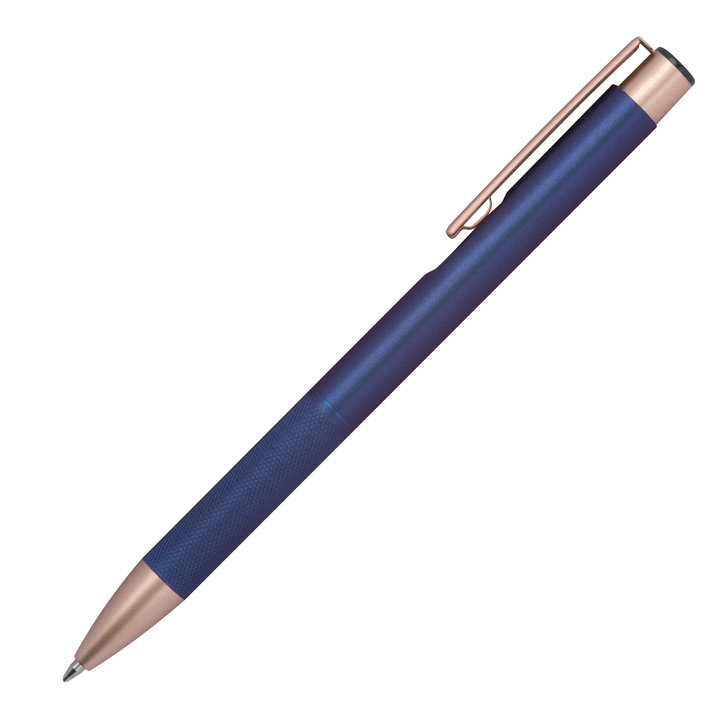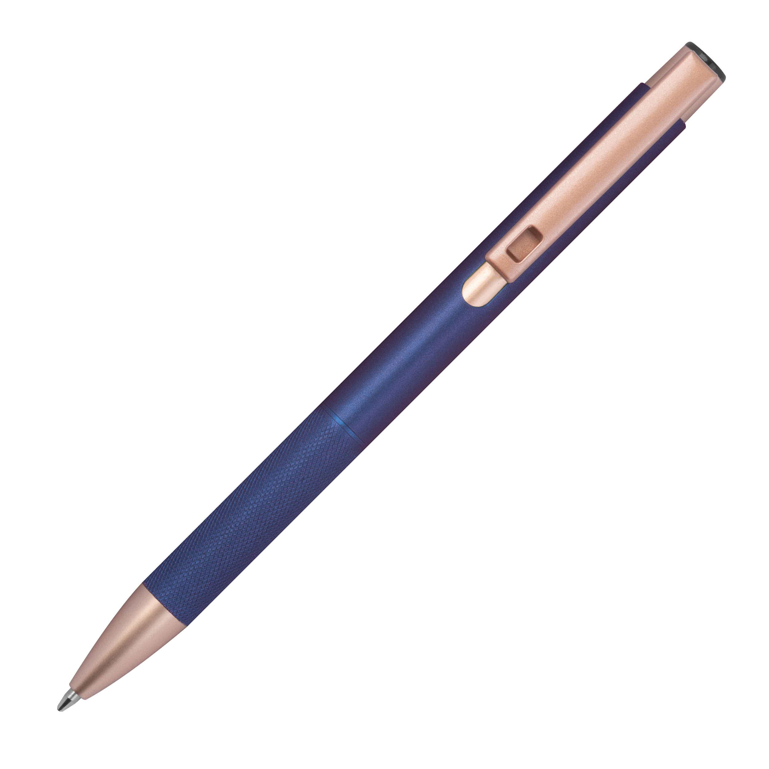 Długopis wykonany z recyklingowanego aluminium z matowym wykończeniem i akcentami w kolorze różowego złota, wyposażony w niebieski wkład o dużej pojemności i strefę uchwytu ze wzorem w romby.