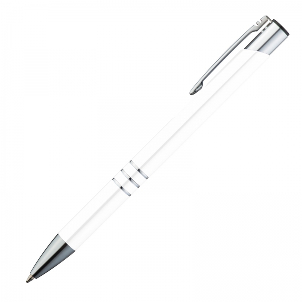 Długopis charakteryzuje się srebrnym wykończeniem klipsu oraz trzema ringami, które elegancko dekorują jego korpus. Żywe, odblaskujące kolory dodają mu nowoczesnego wyglądu i charakteru.