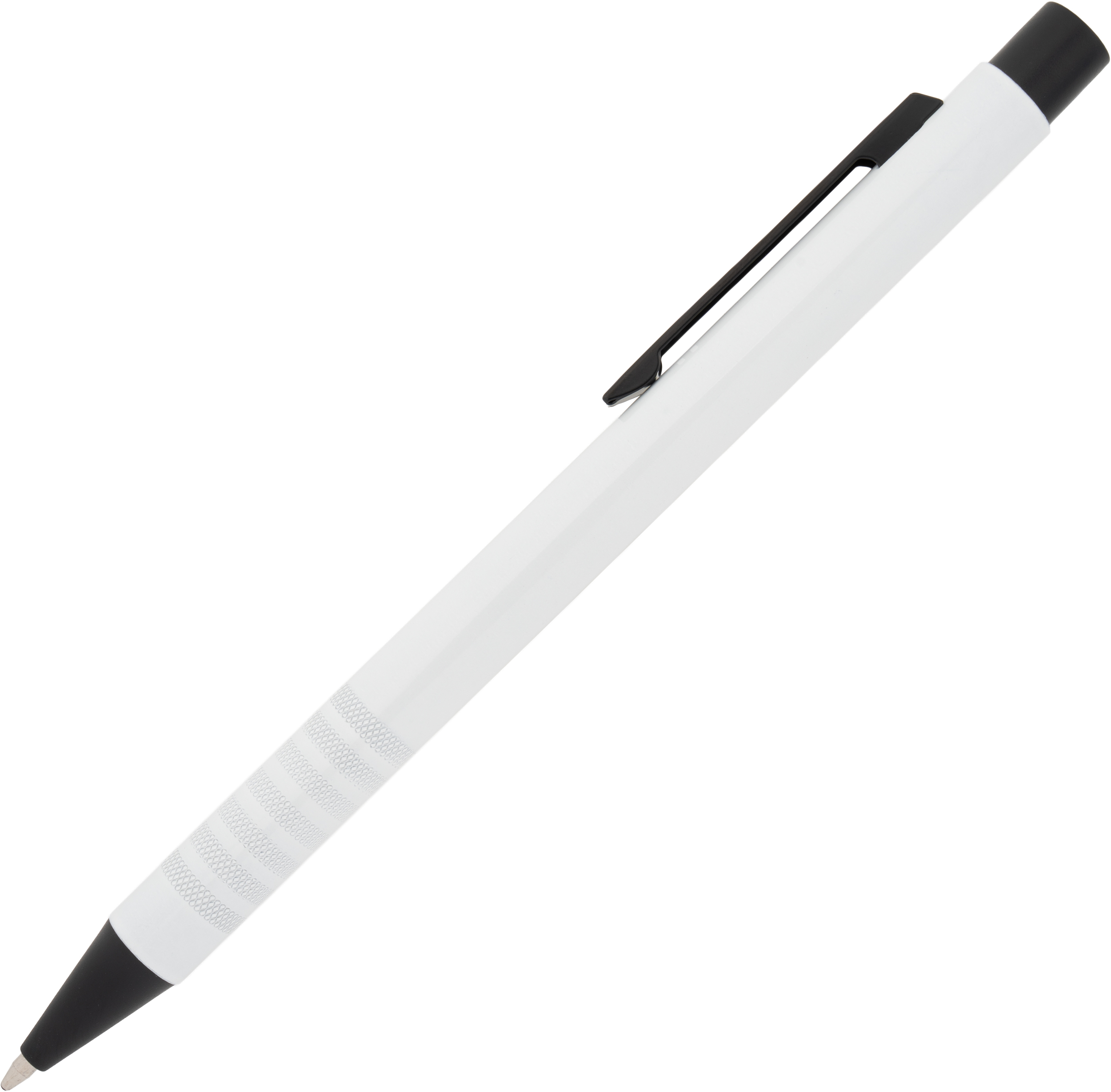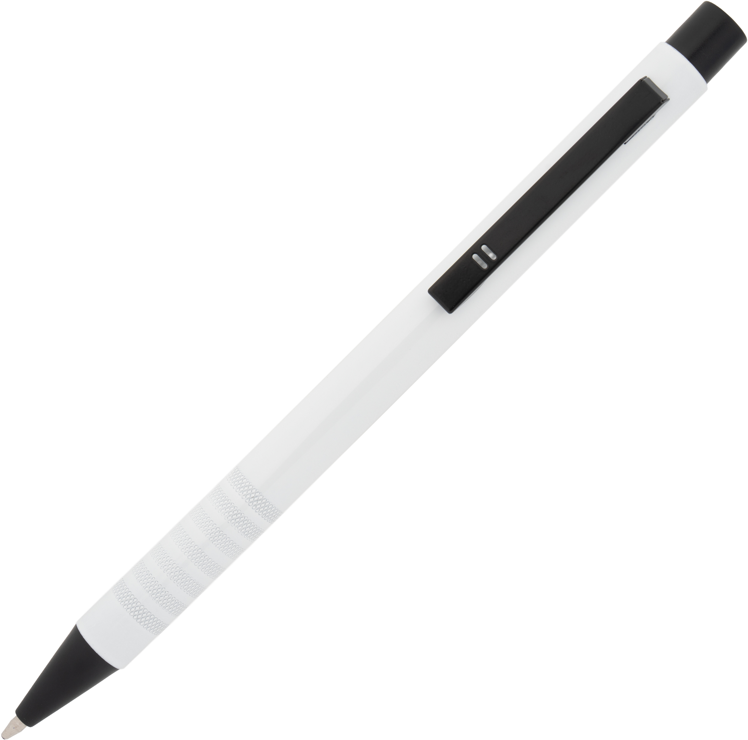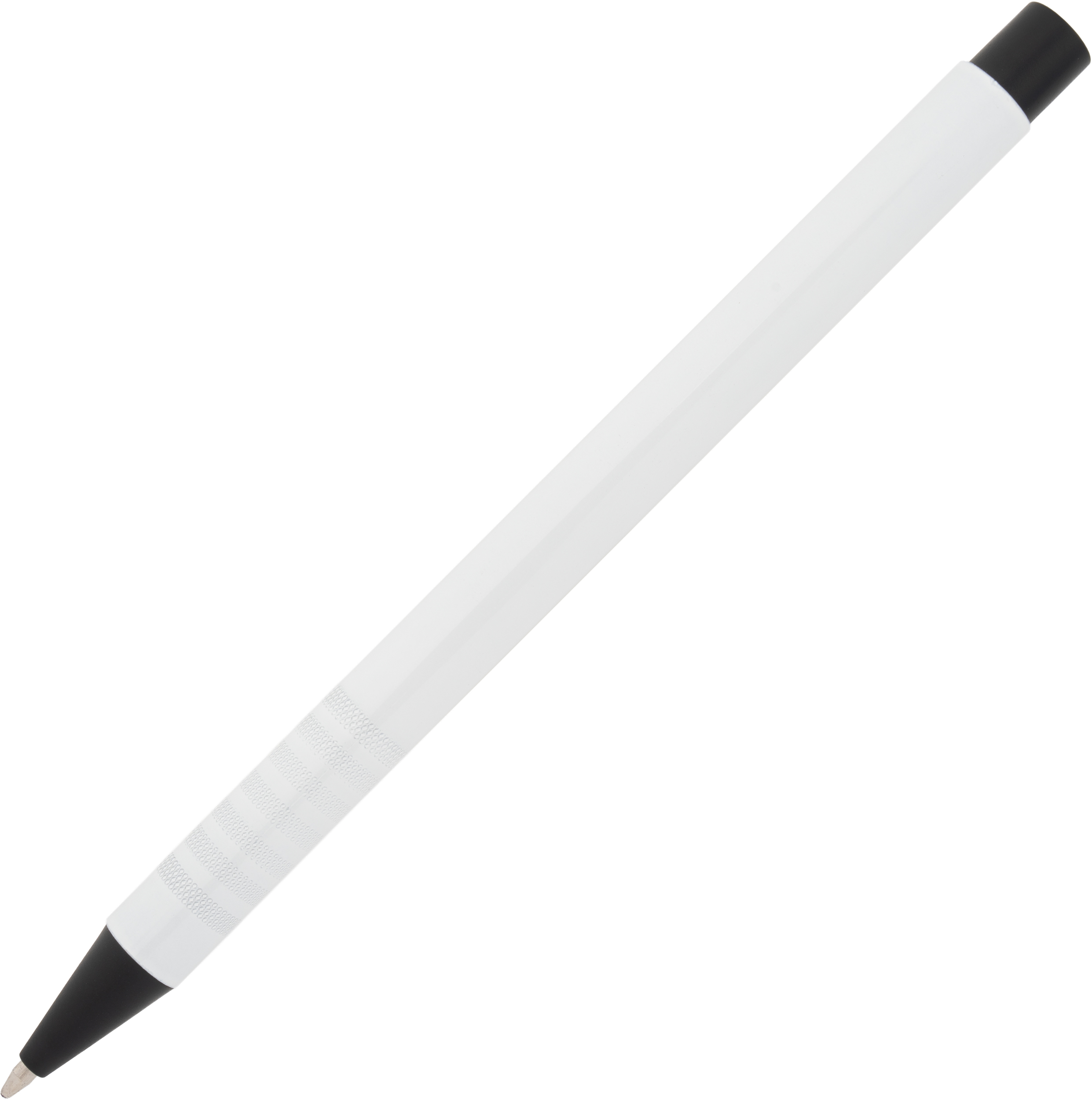 Metalowy długopis z piszącym na niebiesko wkładem o dużej pojemności i ze zdobieniem na korpusie.