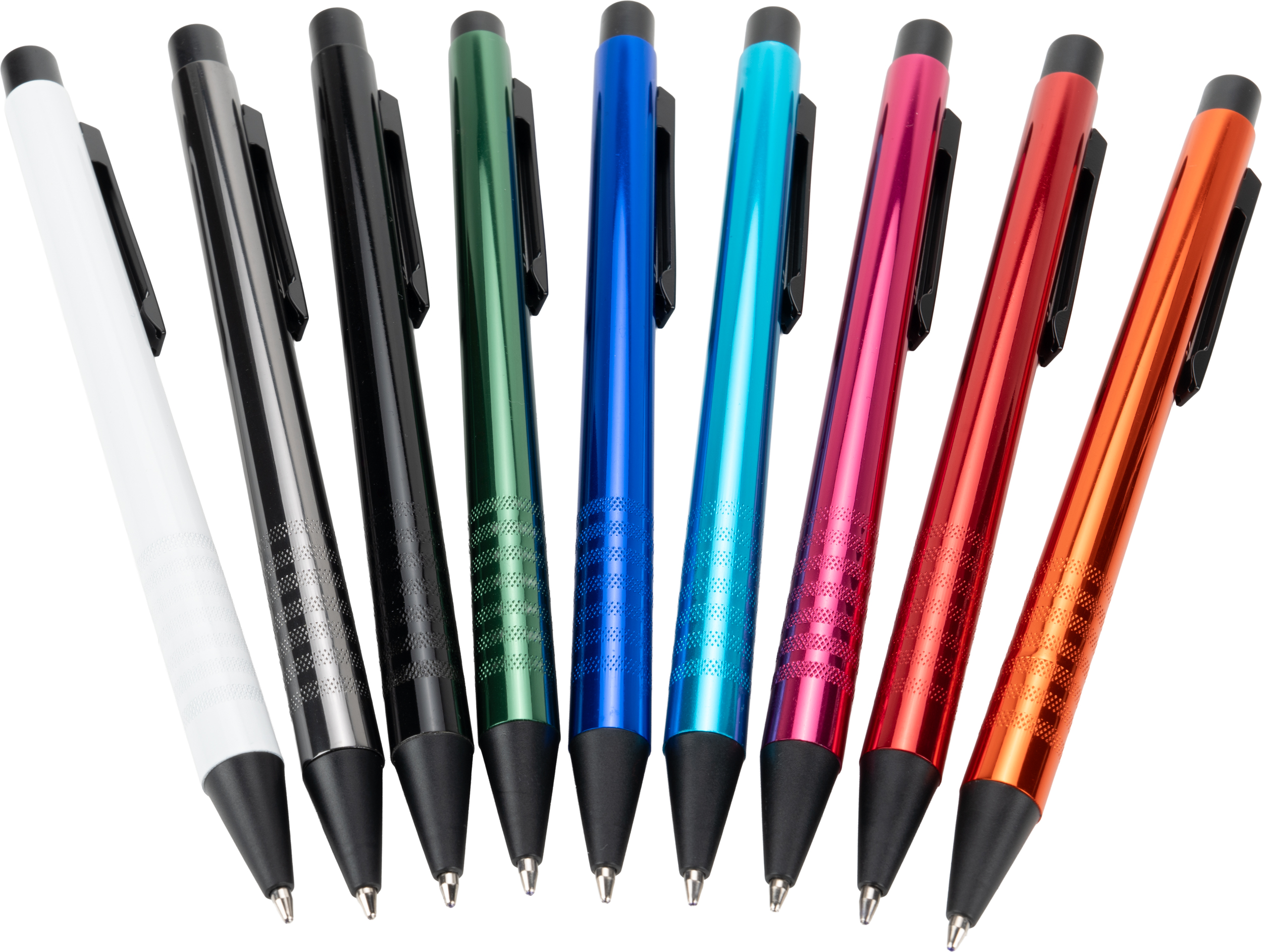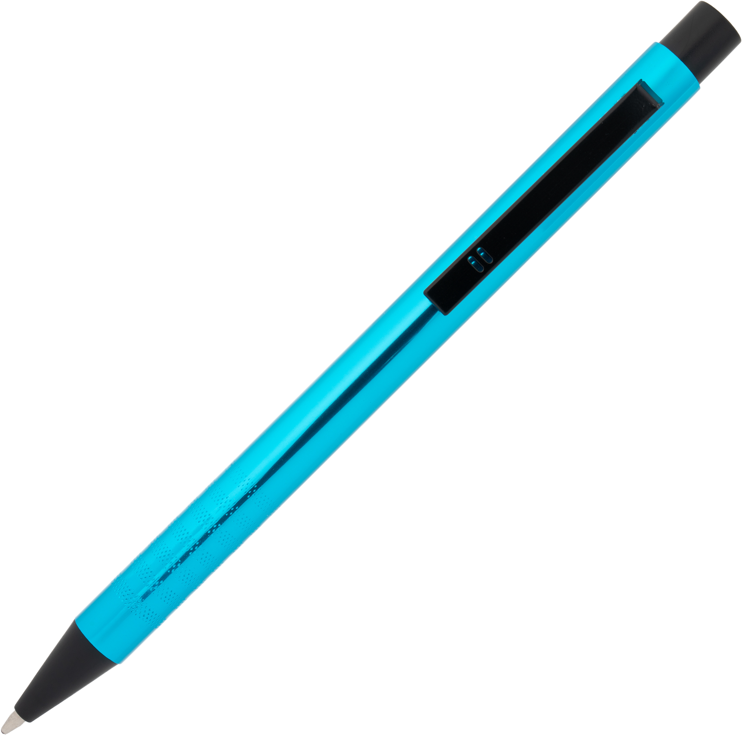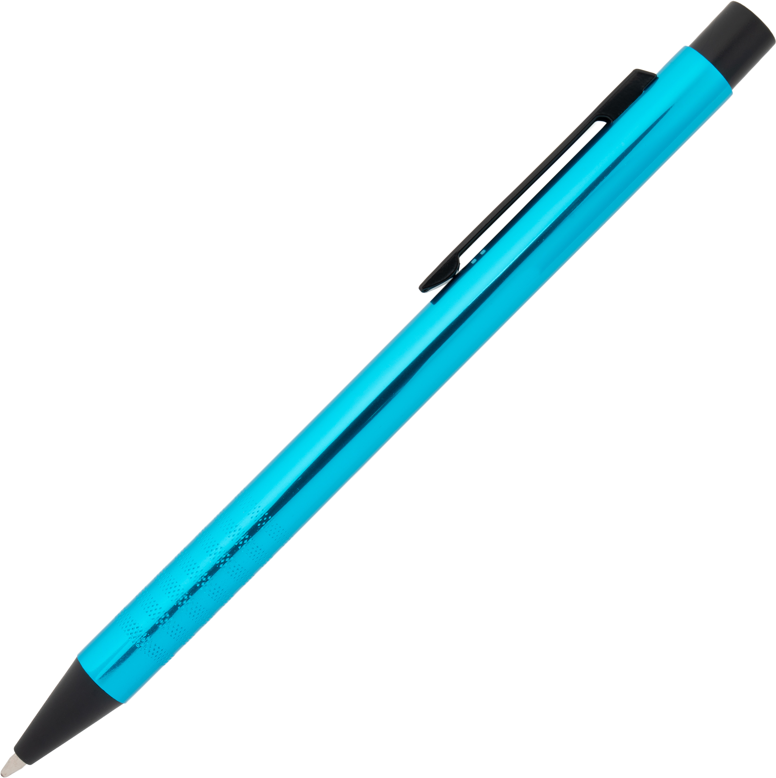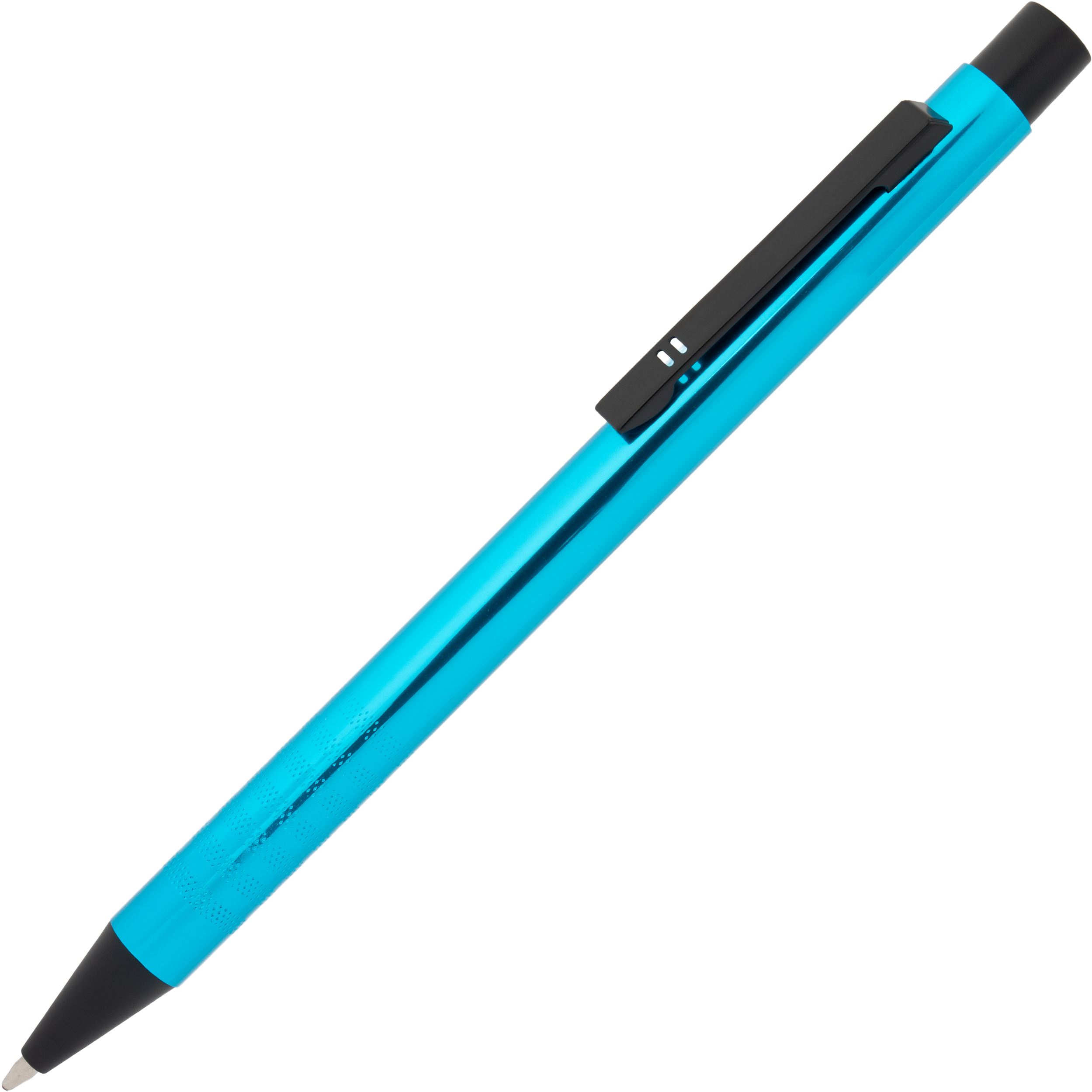 Metalowy długopis z piszącym na niebiesko wkładem o dużej pojemności i ze zdobieniem na korpusie.