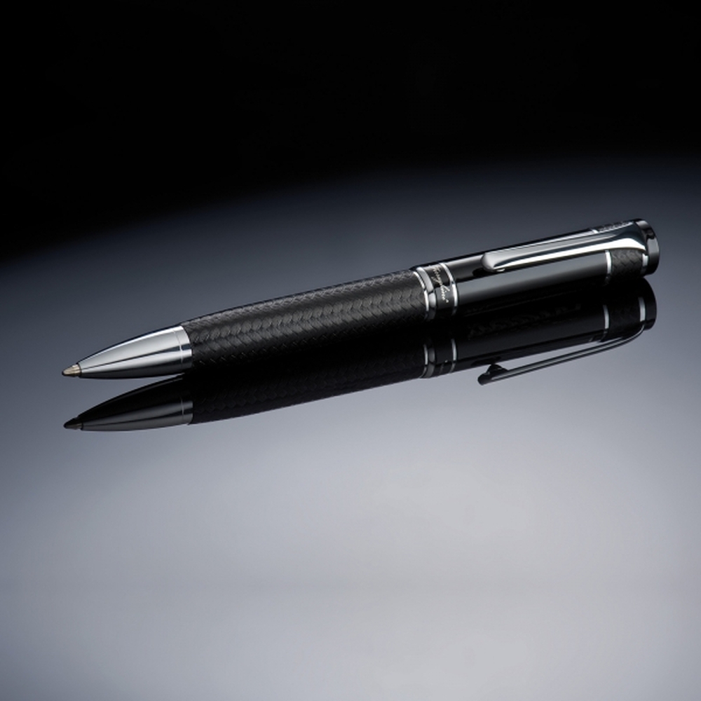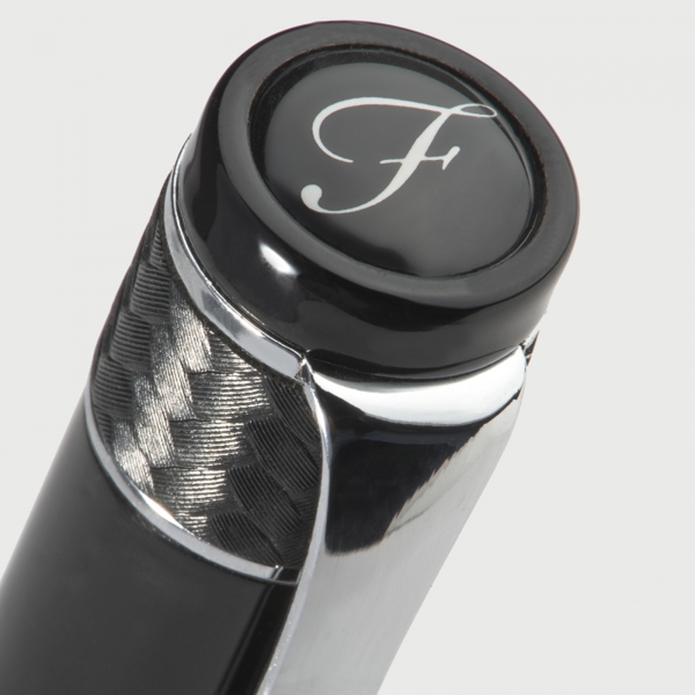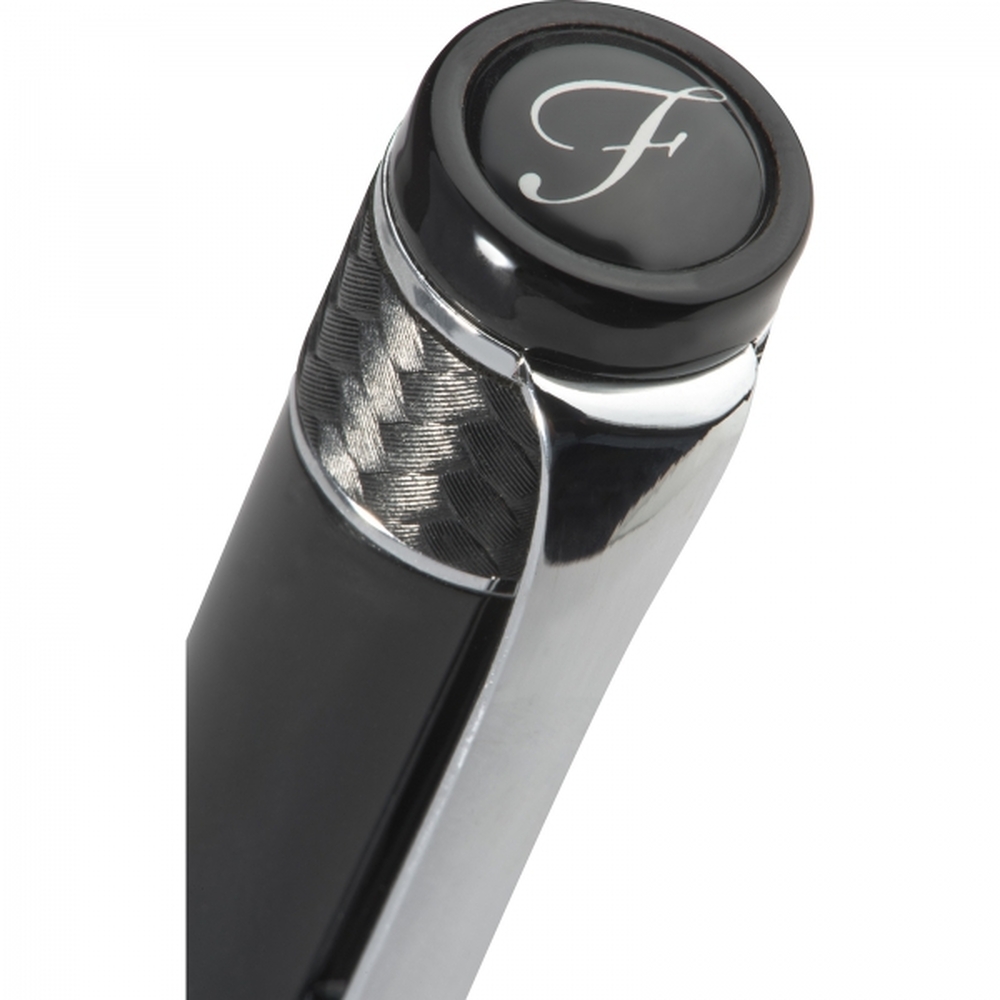 Luksusowy długopis z kolekcji Ferraghini, wyposażony w niebieski wkład. Wykończony delikatnym, przeplatanym materiałem, błyszczącym, czarnym lakierem oraz chromowanymi elementami. W zestawie z dopasowanym, skórzanym etui z magnetycznym zamknięciem, którego wnętrze zostało wyściełane delikatnym zamszem.