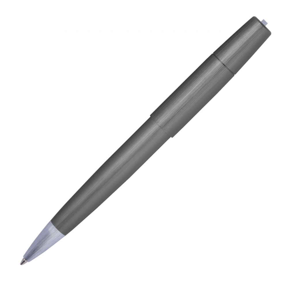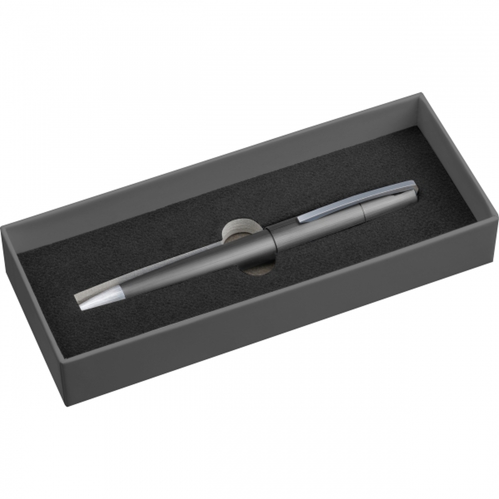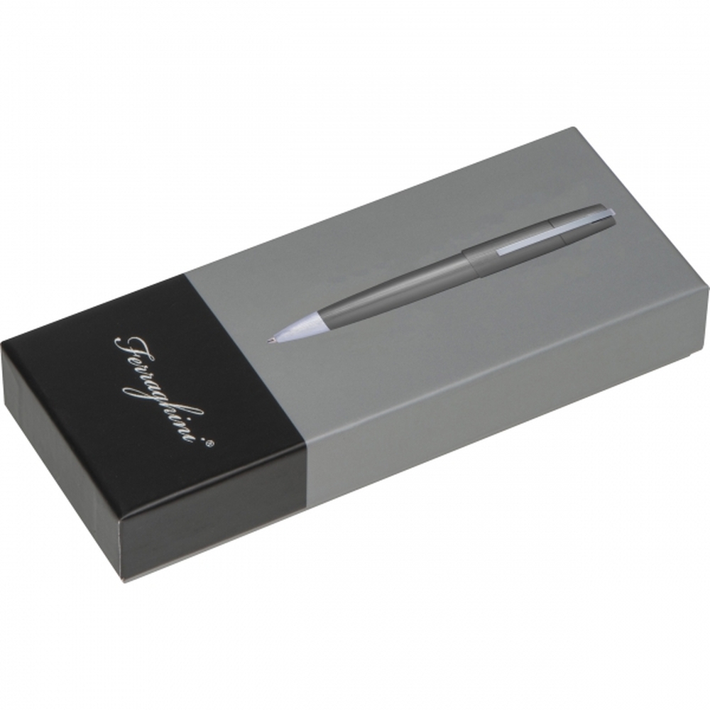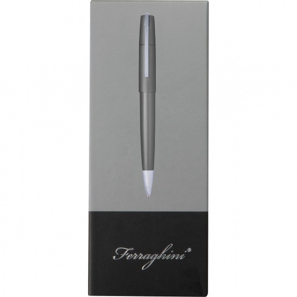 Przekręcany, metalowy długopis marki Ferraghini, ze srebrnymi akcentami i dużym wkładem piszącym na niebiesko.