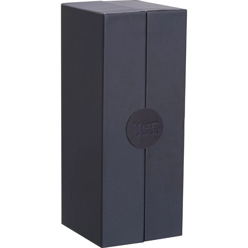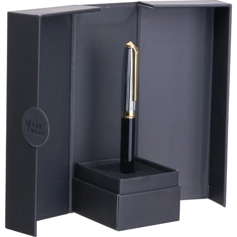 Metalowy długopis Mark Twain ze złotymi akcentami i niebieskim wkładem (o długości pisania 800 m), w magnetycznie zamykanym etui.