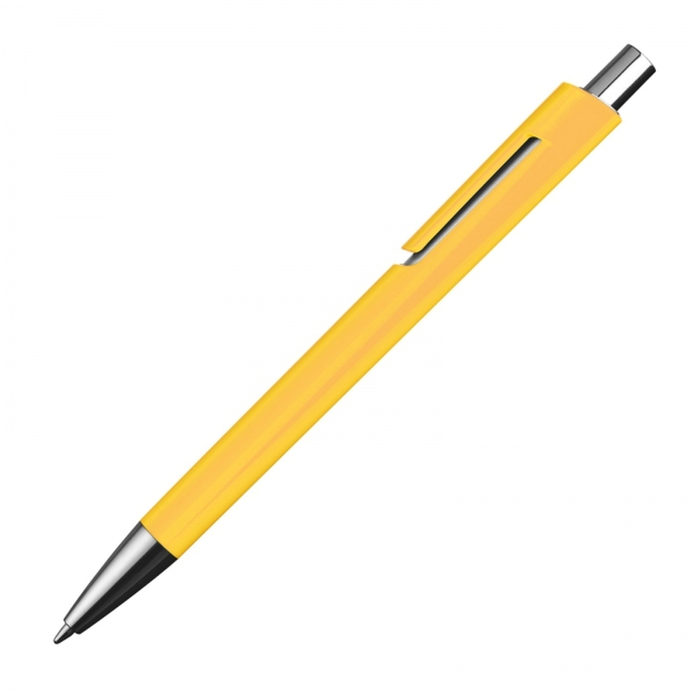 Plastikowy długopis z wkładem piszącym na niebiesko i srebrną aplikacją pod klipem.