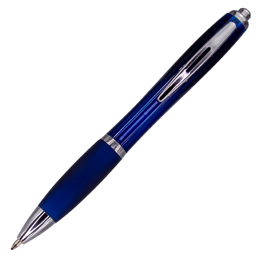 Plastikowy, transparentny długopis z dużym niebieskim wkładem, gumowaną strefą uchwytu i metalowym klipsem.