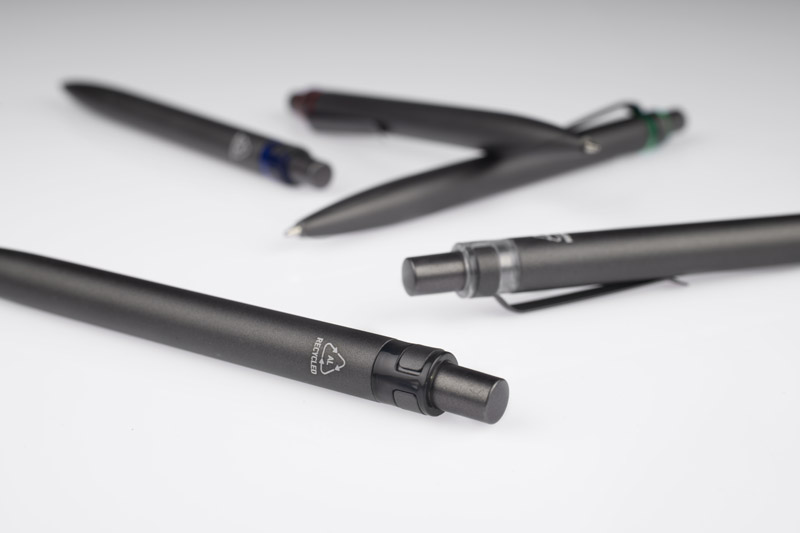 Długopis RAL wykonany jest z recyklingowanego aluminium w eleganckim, grafitowym kolorze z chromowanym wykończeniem. Aluminiowy klips zakończony kolorowym akcentem nadaje mu nowoczesny i rozpoznawalny wygląd. Mechanizm wysuwu jest automatyczny, co zapewnia wygodę i szybkie użycie w każdej sytuacji. Smukła forma oraz przyjemny w dotyku korpus gwarantują komfort pisania. Wkład typu G2 o grubości linii 1,0 mm zapewnia płynny i precyzyjny zapis. To praktyczny gadżet reklamowy, który świetnie sprawdzi się w biurze i podczas spotkań biznesowych.