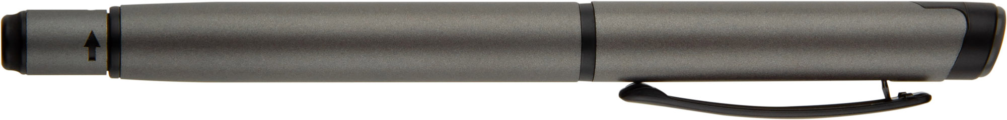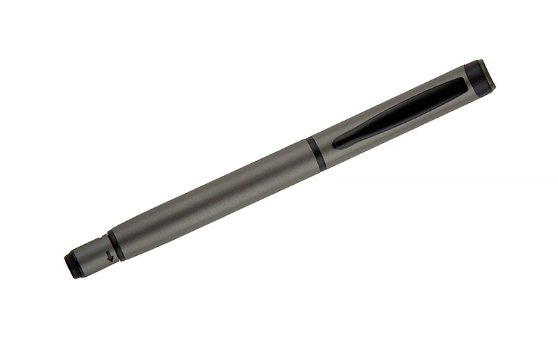 Długopis ROTIS to aluminiowy model z żelowym wkładem typu free ink, zamykany klasyczną zatyczką. Korpus o półmatowym wykończeniu uzupełnia czarny, metalowy klips, który dodaje elegancji. Obrotowa końcówka z wbudowanym spinnerem pełni funkcję antystresową – umieszczona na niej czarna strzałka, wytłoczona w materiale, subtelnie sugeruje kierunek obrotu.