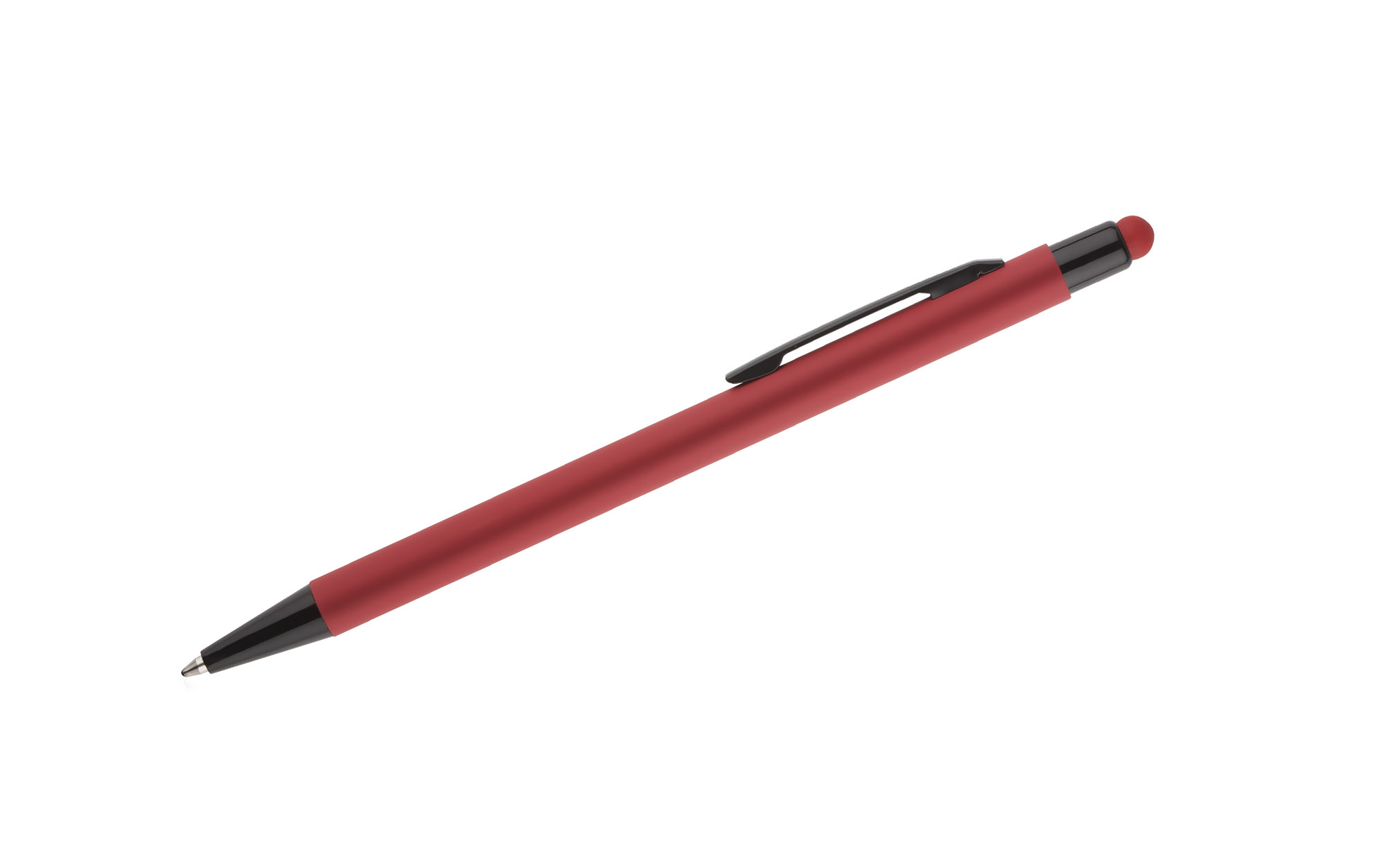 Klasyczny, cienki długopis PRIM wykonany z aluminium pokrytego gumowaną powłoką typu soft touch. Na górze końcówka do obsługi ekranów dotykowych w kolorze dopasowanym do korpusu długopisu. Wykończenia w kolorze czarnym. Długopis automatyczny. Wkład typu X20 w kolorze niebieskim.