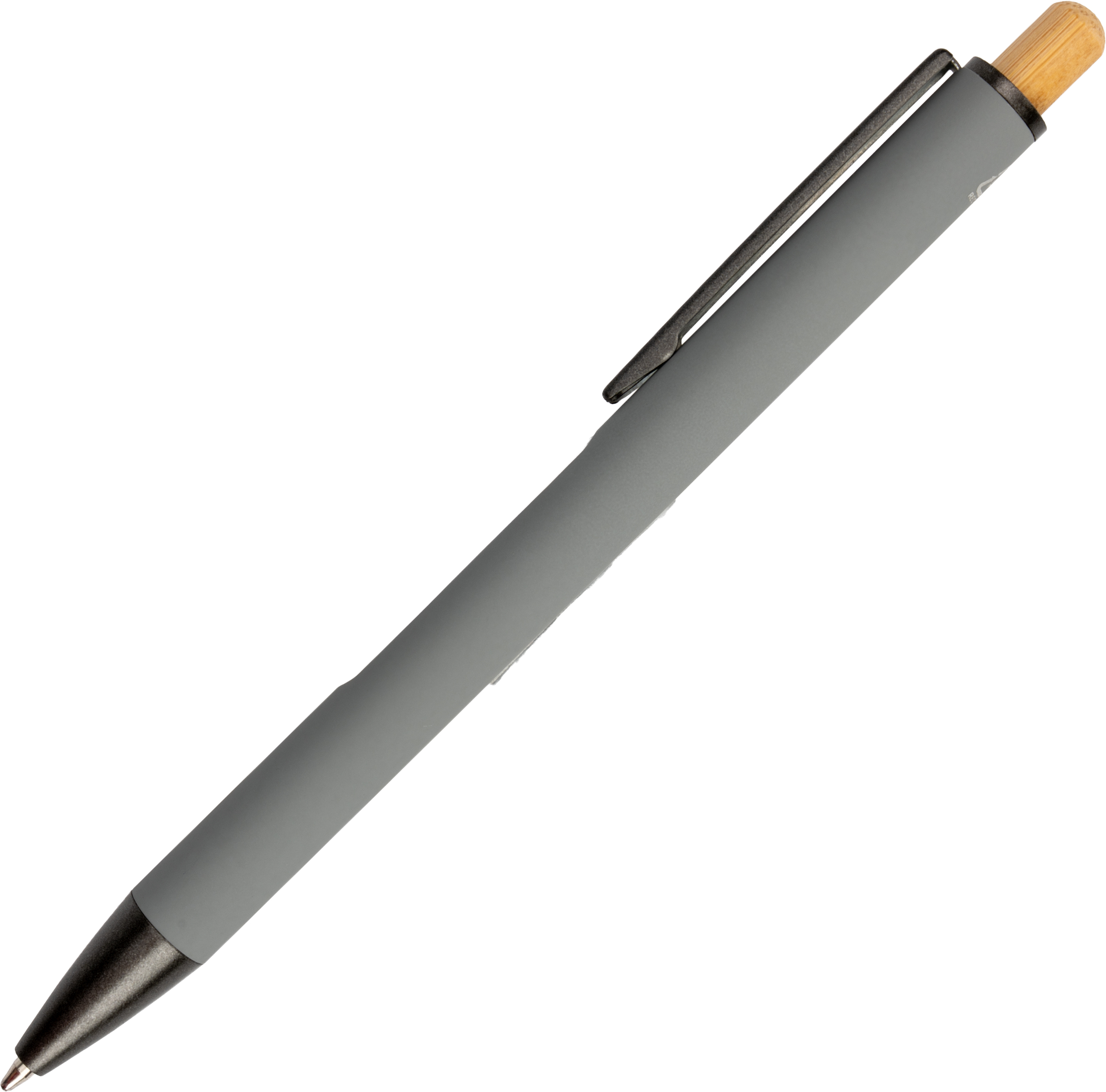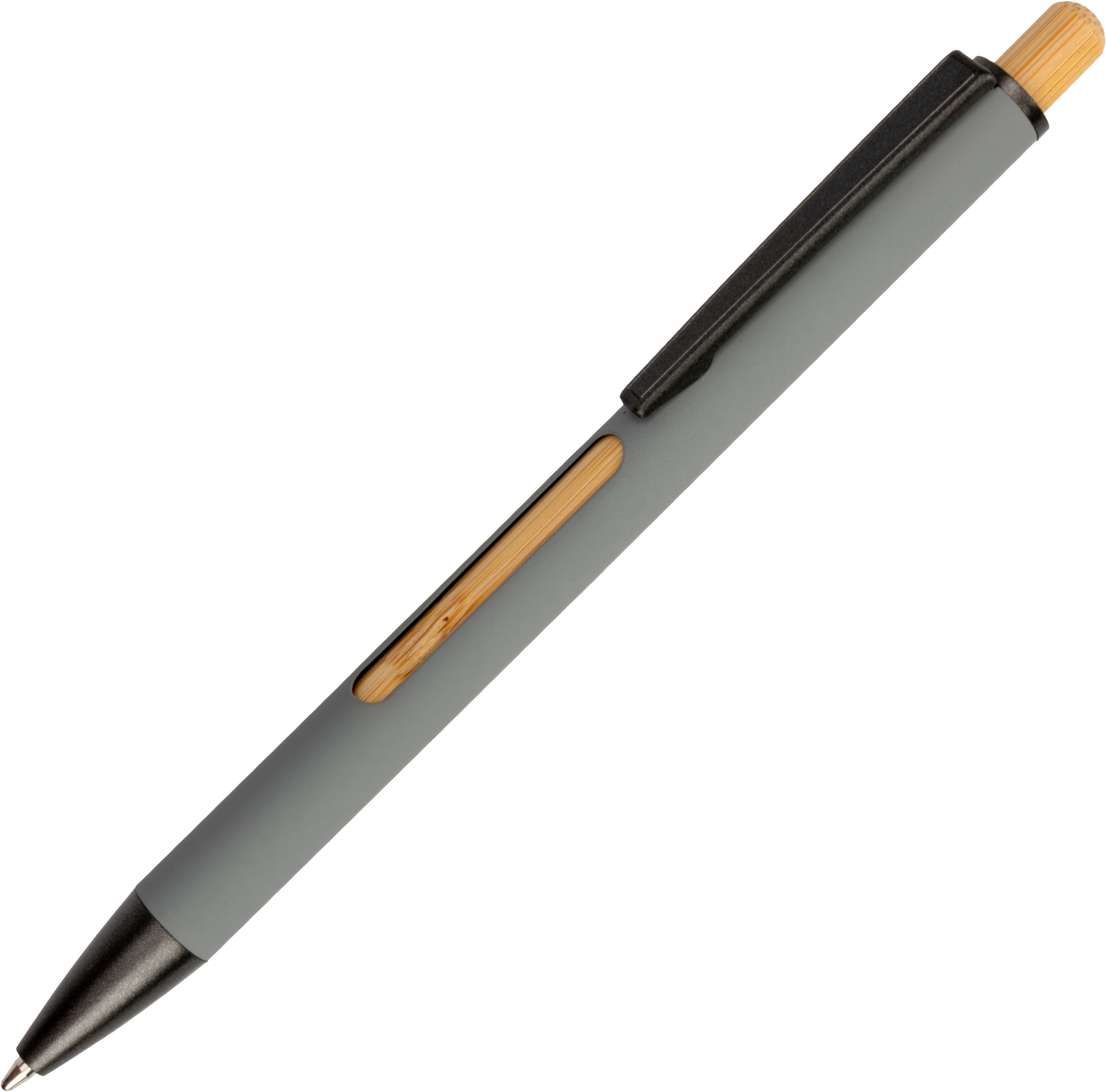 Długopis wykonany z aluminium z recyklingu, metalowym klipsem, bambusowymi akcentami i niebieskim wkładem.