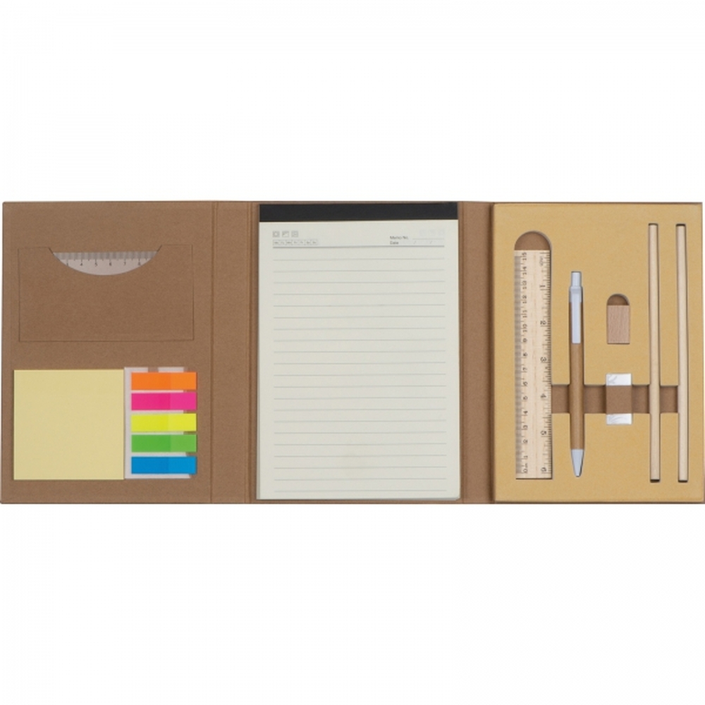 W środku znajduje się 80-stronicowy notes w linie, a także 20 kolorowych samoprzylepnych karteczek w 5 różnych kolorach, które ułatwiają oznaczanie i organizowanie ważnych informacji. Zestaw zawiera również dwie linijki (w tym jedną drewnianą), długopis, drewnianą temperówkę, gumkę do ścierania oraz dwa ołówki.To idealne rozwiązanie zarówno do biura, jak i na prezent dla osób ceniących porządek i wygodę w codziennej pracy.