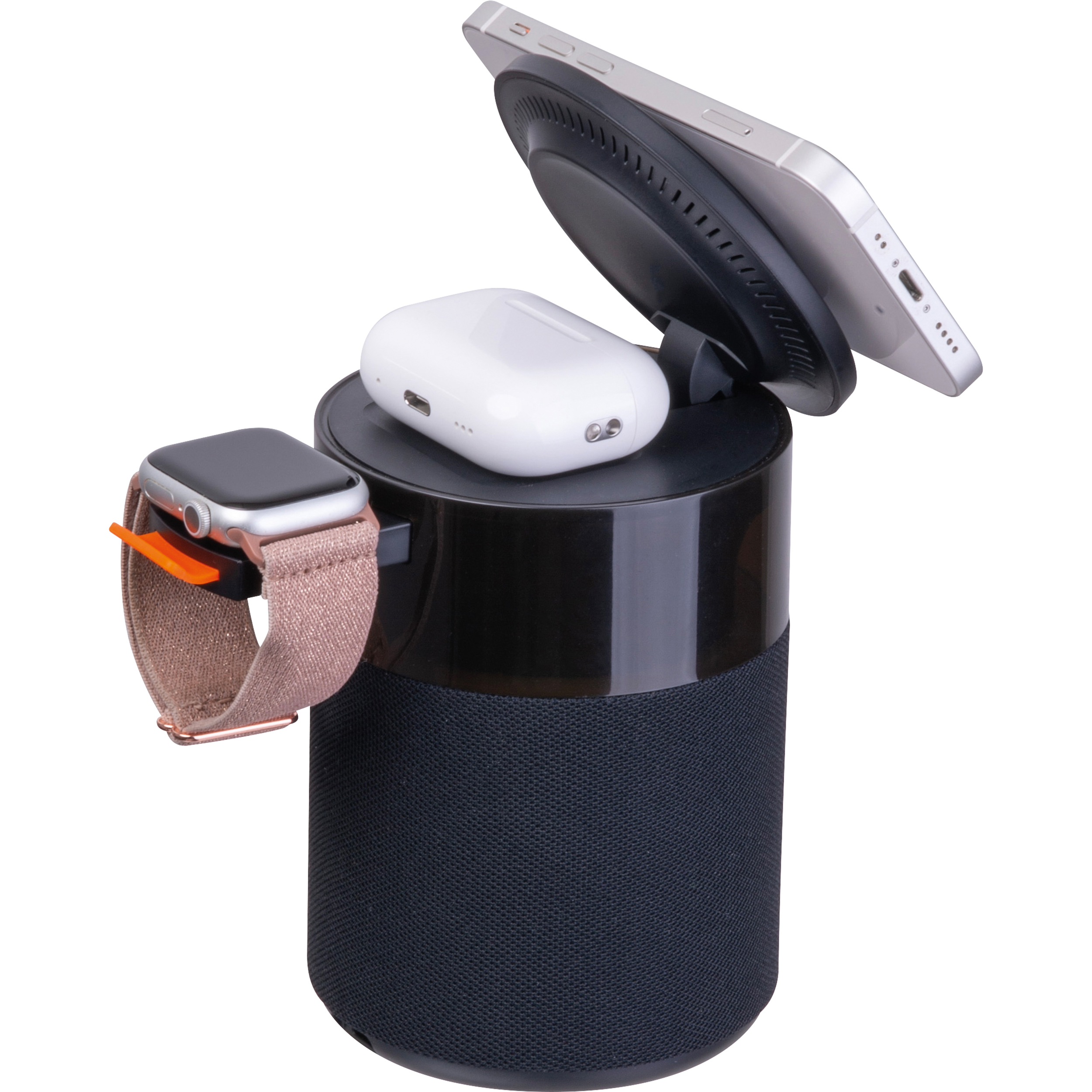 Głośnik Bluetooth 5.4 o mocy 5W, marki Ferraghini z wbudowaną bezprzewodową ładowarką do smartfona, słuchawek oraz smartwatcha. Wyposażony w diodę LED.
