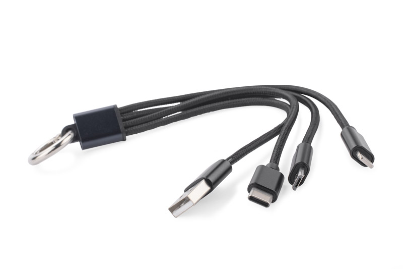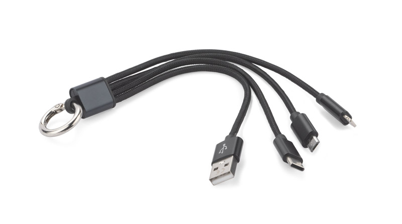 Kabel USB 3 w 1 TAUS do ładowania różnych urządzeń posiada trzy końcówki: micro USB, Lightning (iPhone) i USB typu C. Kabel jest powleczony tkaniną, a końcówki USB są wykonane z metalu. Praktyczny gadżet dla każdego użytkownika mobilnych urządzeń.