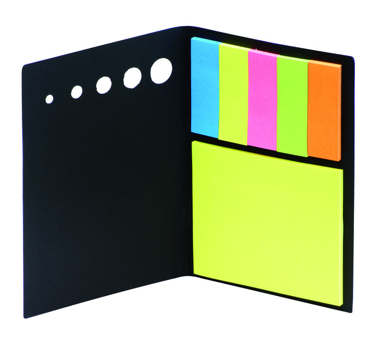 Karteczki samoprzylepne w pięciu kolorach oraz samoprzylepny notesik, umieszczone w czarnej okładce. Logo nadrukujemy na etui metodą tampodruku.