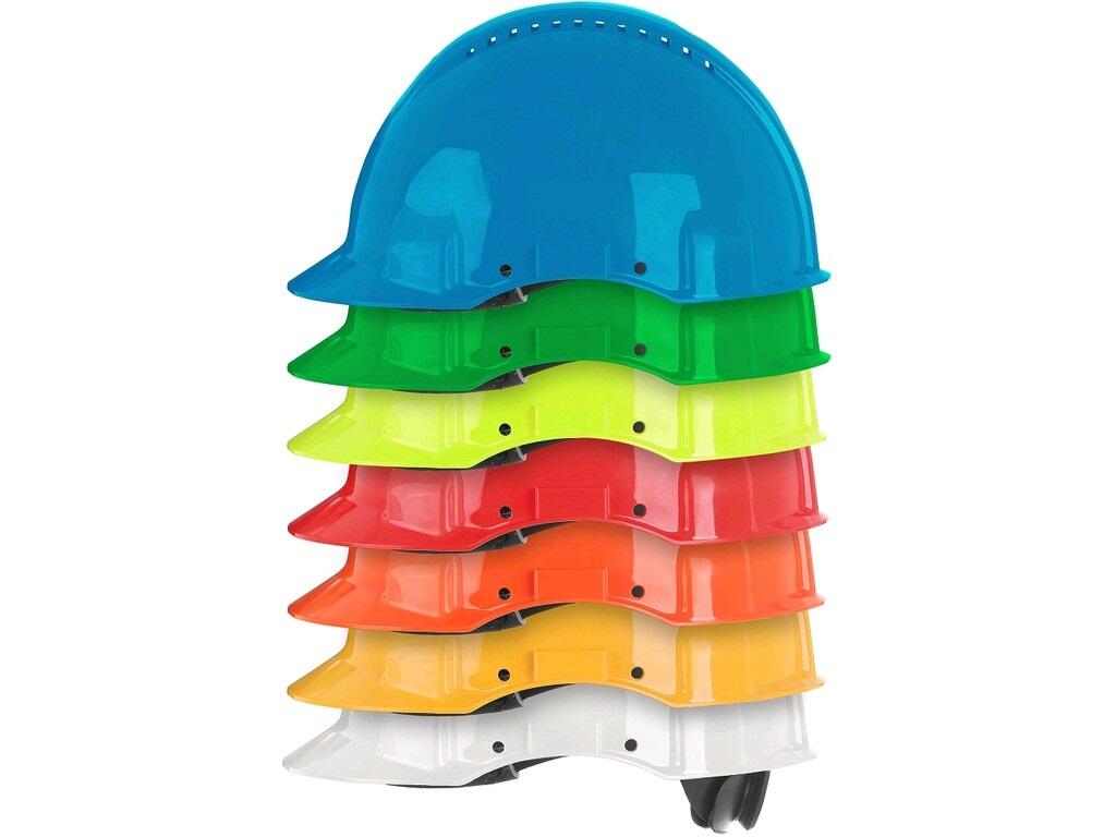 Hełm ochronny, 4-punktowe tekstylne zamocowanie z więźbą o płynnej regulacji, odporny na temperatury od -30°C do +50°C, waga: 310 g, uvicator wskazujący żywotność kasku, możliwość odwrócenia systemu mocującego o 180° pozwala nosić kask częścią przednią do tyłu. Zalecane zastosowanie: przemysł budowlany i lekki.