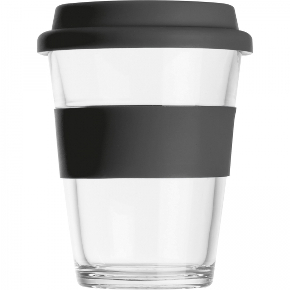 Kubek o pojemności 300ml, wykonany ze szkła, z silikonową pokrywką i silikonowym pierścieniem-nakładką, dzięki której nie ma ryzyka poparzenia dłoni.