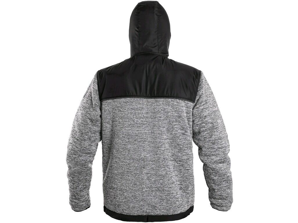 Męska kurtka z dzianiny, ciepła podszewka, kombinacja materiałów, kaptur nieodpinany, ściągacz w dolnej części, rękawy zakończone gumką, elementy odblaskowe, kieszeń na piersi na przykryty zamek, 2 dolne kieszenie na zamek.