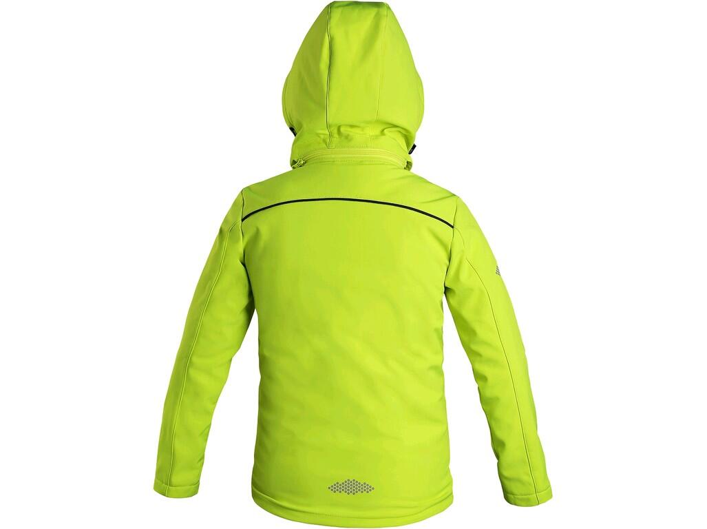 Dziecięca kurtka softshellowa z odpinanym kapturem, wodoodporna, odporna na działanie wiatru, rękaw z elastycznym wewnętrznym mankietem, ściągacz w dolnej części, kołnierz i podszewka z polaru, 2 dolne kieszenie na zamek, kieszeń na piersi na zamek, elementy odblaskowe, TPU membrana, odporność na przenikanie wody 10 000mm poza strefą szwów, paroprzepuszczalność 3 000g/m2/24 godz.