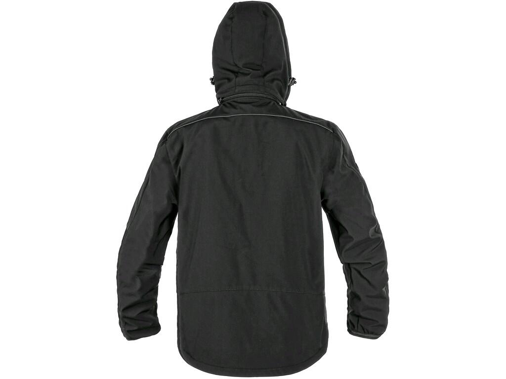 Męska kurtka softshellowa, wodoodporna, odporna na działanie wiatru, odpinany kaptur, rękaw z elastycznym wewnętrznym mankietem, ściągacz w dolnej części, czarne elementy odblaskowe, kołnierz i podszewka z polaru, TPU membrana, odporność na przenikanie wody 10 000 mm poza strefą szwów, paroprzepuszczalność 3 000 g/m2/24 godz. Na lewym rękawie kieszeń na zamek, 2 dolne kieszenie na zamek, kieszeń na piersi na zamek.