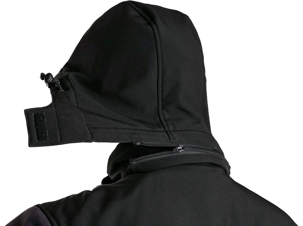 Męska kurtka softshellowa z odpinanym kapturem, wodoodporna, odporna na działanie wiatru, zamykanie na zamek, wentylacja pod pachami, rękawy z regulowanym mankietem, kieszeń na piersi na zamek, ściągacz w dolnej części, 2 kieszenie boczne na zamek, elementy odblaskowe, TPU membrana. Wodoodporność poza strefą szwów 10 000mm, paroprzepuszczalność 3 000g/m2/24 godz.