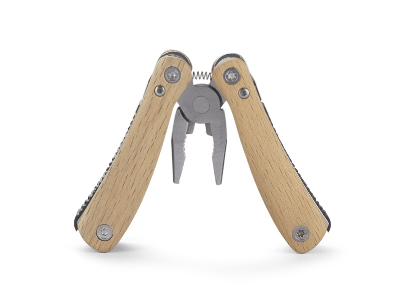 Narzędzie wielofunkcyjne FORT to gadżet w kieszonkowym rozmiarze, wykończony drewnem. Funkcje: kombinerki, przecinak, nóż, śrubokręt płaski i krzyżowy, pilnik, piła, otwieracz do butelek i puszek. W komplecie znajduje się również czarny, materiałowy pokrowiec na narzędzie.