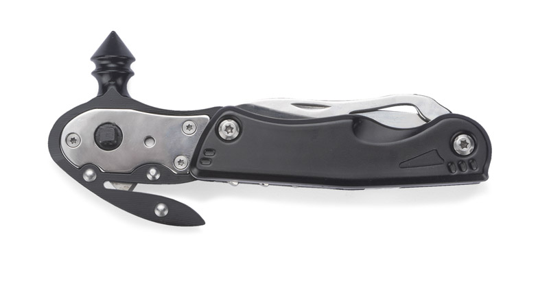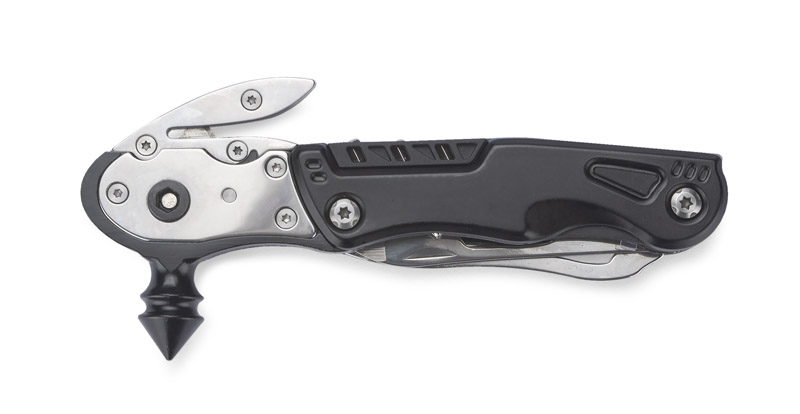 ESCAPE to niezbędne wyposażenie każdego samochodu, które warto mieć zawsze pod ręką. Zawiera aż 11 funkcji w jednym narzędziu z czego najważniejszymi są zbijak do szyb oraz przecinak do pasów bezpieczeństwa. Dodatkowo posiada takie funkcje jak: latarka, nóż, komplet 3 bitów, dwukierunkowy uchwyt na bity, uniwersalny klucz sześciokątny, płaski śrubokręt, piłę oraz otwieracz do butelek i puszek. W komplecie znajduje się również czarny, materiałowy pokrowiec na narzędzie.