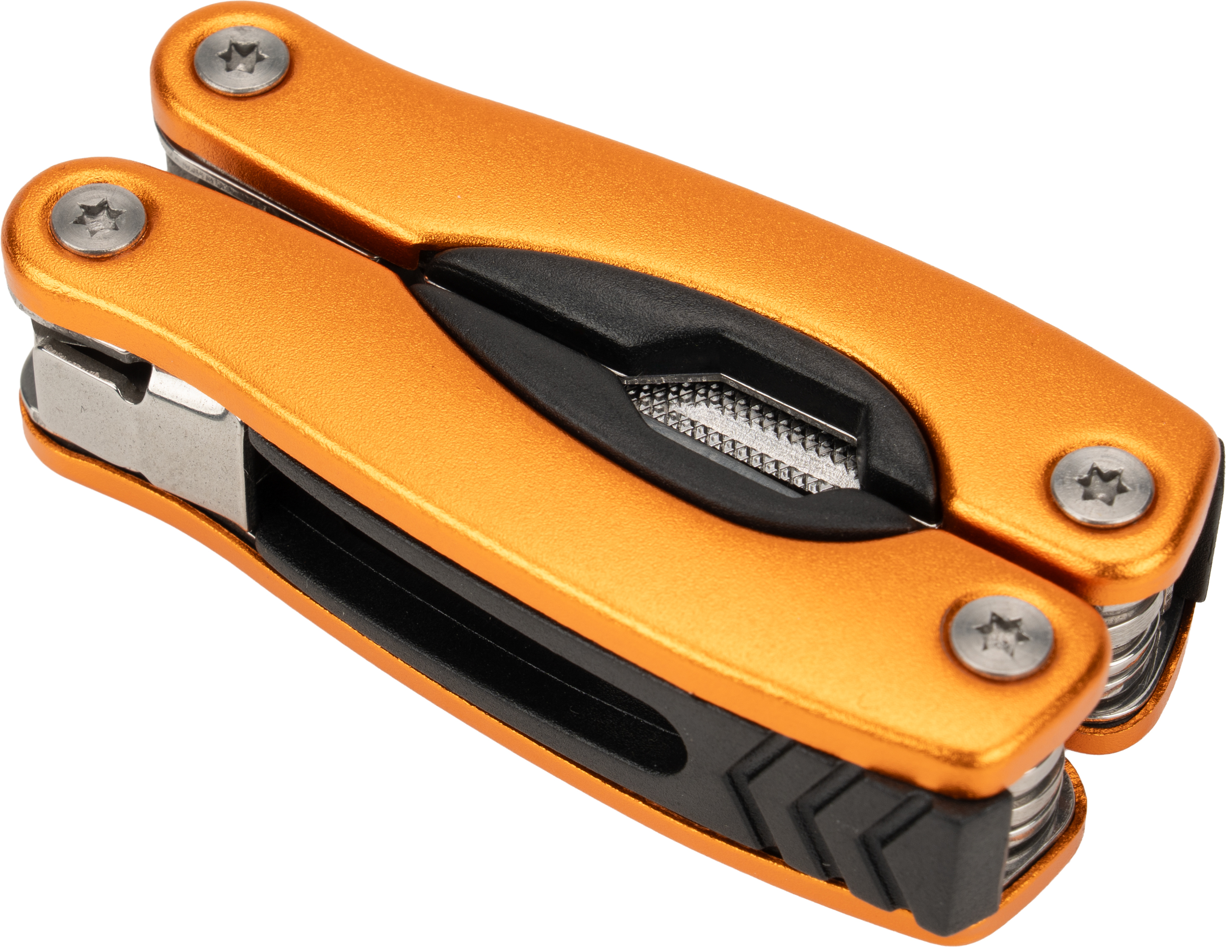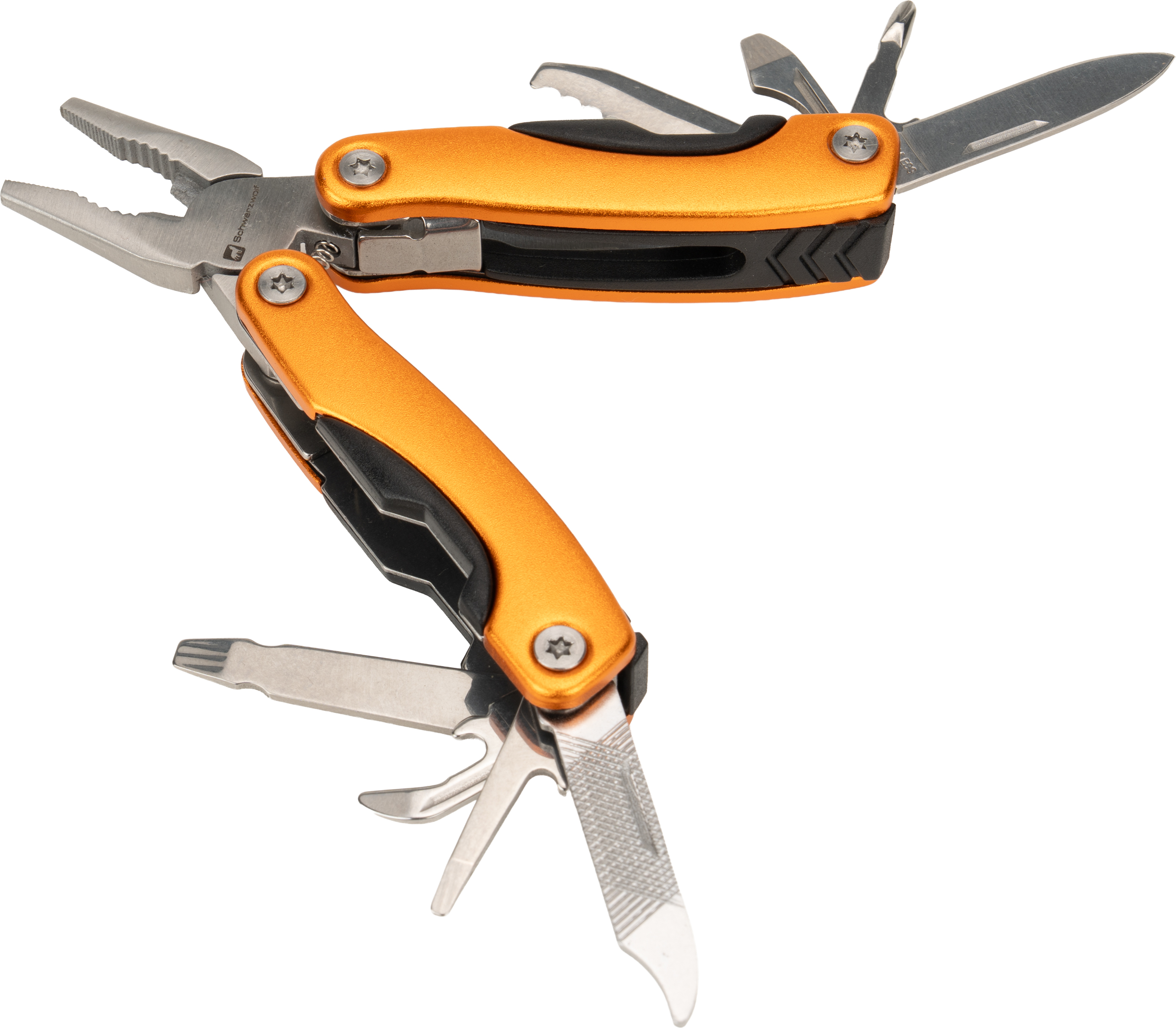 Multitool posiada 13 narzędzi, m.in.: kombinerki, pilnik, śrubokręt płaski i Philips, nóż, piłka, otwieracz do butelek i konserw. Narzędzie zapakowane w neoprenowy pokrowiec.