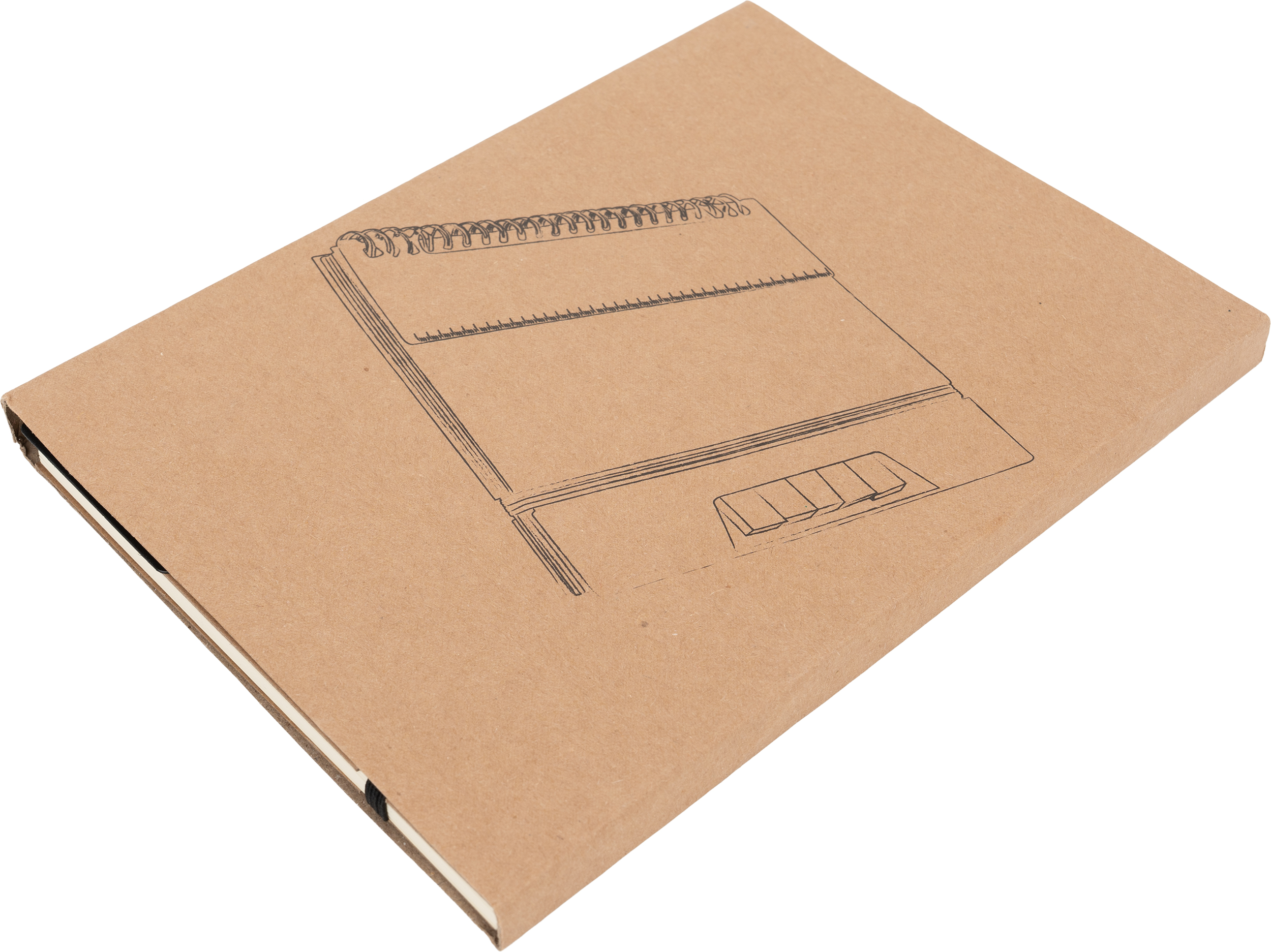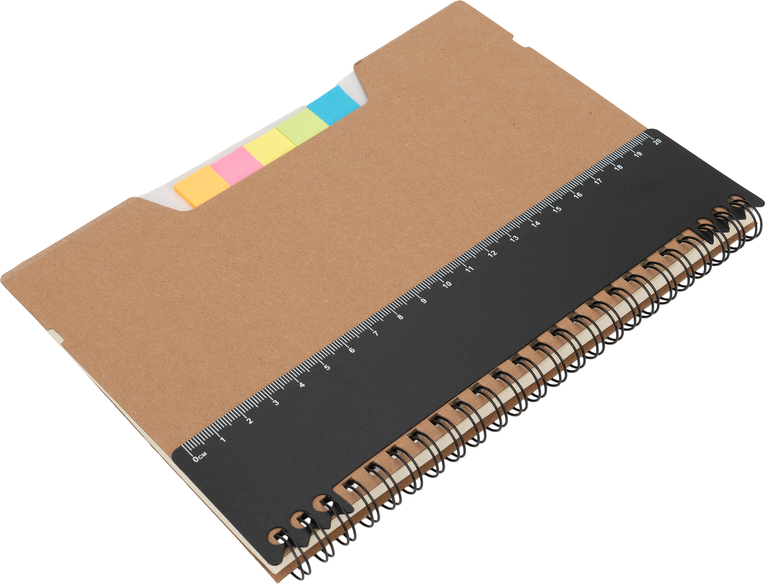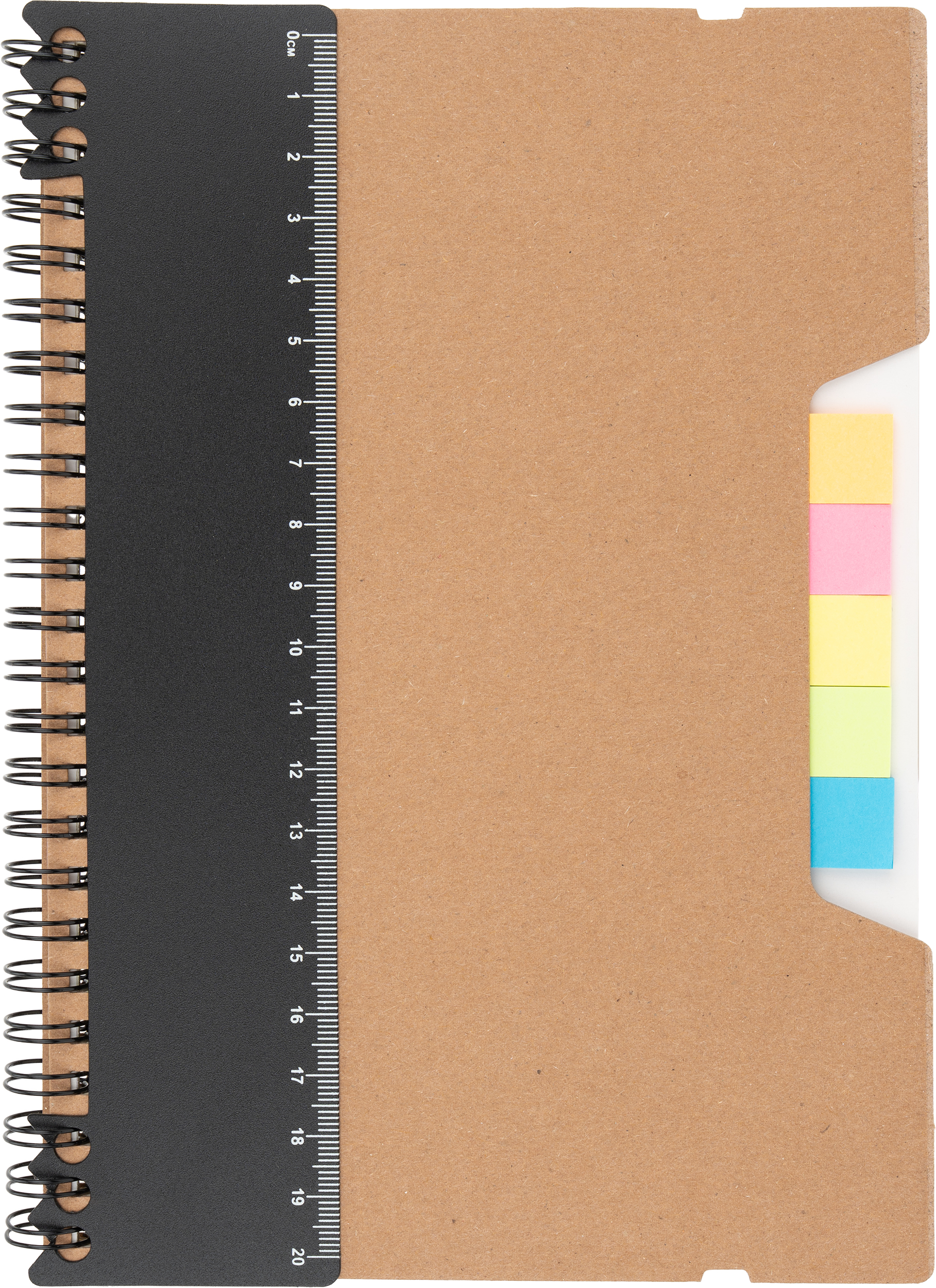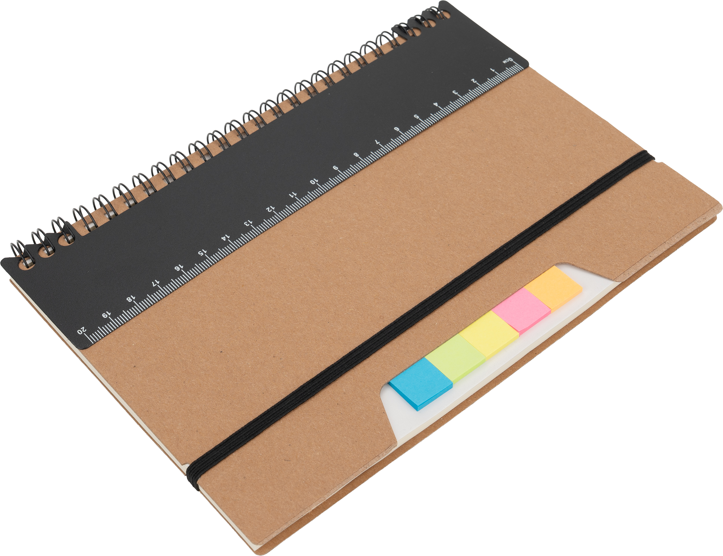 Notes A5 w kartonowej okładce z plastikową linijką, 120 stronami w kropki, karteczkami samoprzylepnymi i zamknięciem na gumkę.
