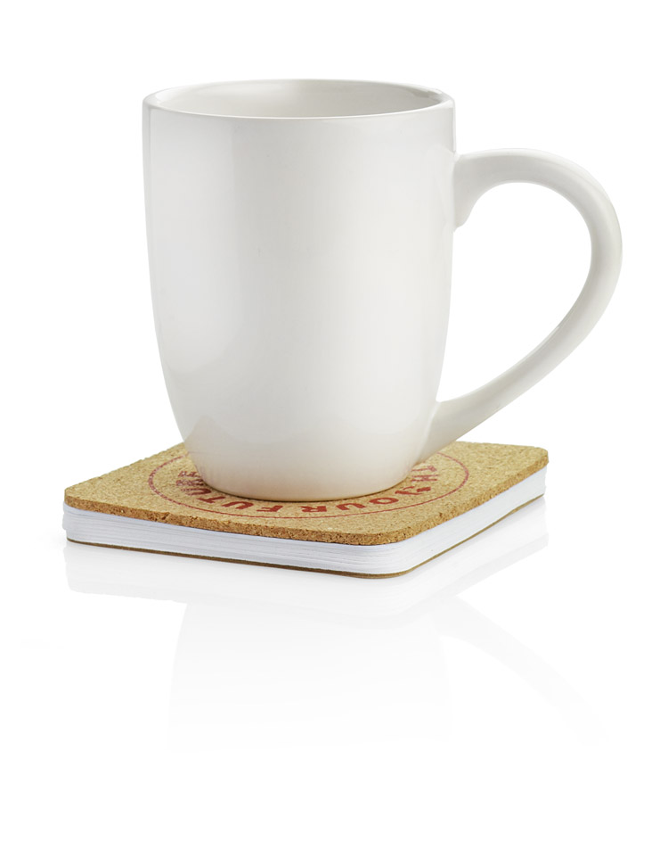 Notes zawierający 60 białych kartek może także posłużyć jako korkowa podstawka pod kubek. Logo możemy nadrukować na powierzchni korkowej i tekturowej.