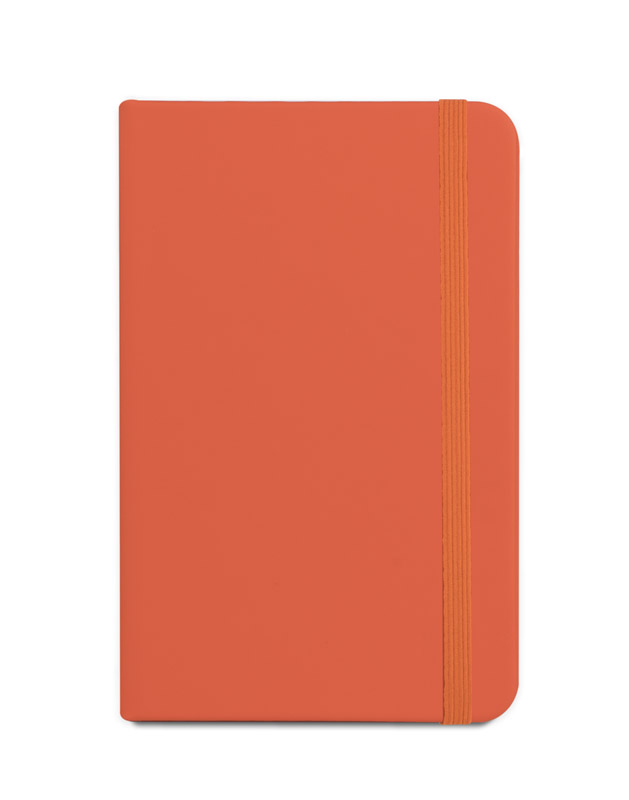 Gustowny notes A6 z kolorową gumką wykonany z materiału skóropodobnego (PU). Notes zawiera 80 kartek ecru w linie koloru pomarańczowego. Logo nadrukujemy na okładce.