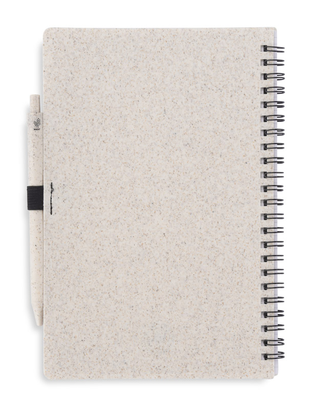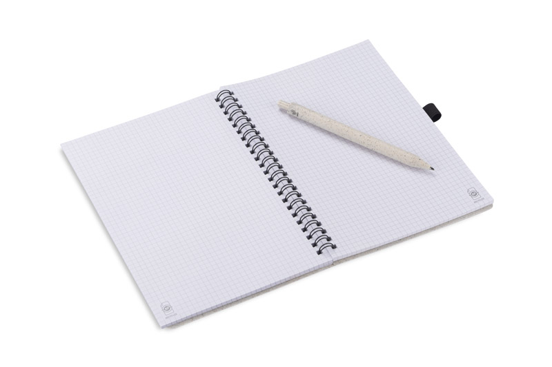 Notes TRESA z długopisem, kolorystyką dopasowanym do okładki. Długopis oraz okładka notesu wykonane są ze słomy pszenicznej. Notes na spirali, posiada 70 kartek w kratkę wykonanych z recyklingowanego papieru. Format A5. Wkład w długopisie w kolorze niebieskim.