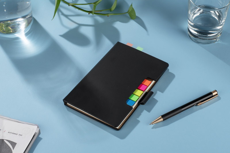 Notes STIKLO w formacie A6 to praktyczny gadżet biurowy, który łączy klasyczny notes z zestawem karteczek samoprzylepnych. Zawiera 80 białych kartek w kratkę, uchwyt na długopis oraz klejoną oprawę, która zapewnia wygodne użytkowanie. Dzięki dodatkowym zakładkom samoprzylepnym doskonale sprawdzi się do organizacji notatek, dokumentów czy planowania zadań. Kompaktowy i funkcjonalny – idealny do pracy biurowej, na spotkania czy jako element zestawu promocyjnego.