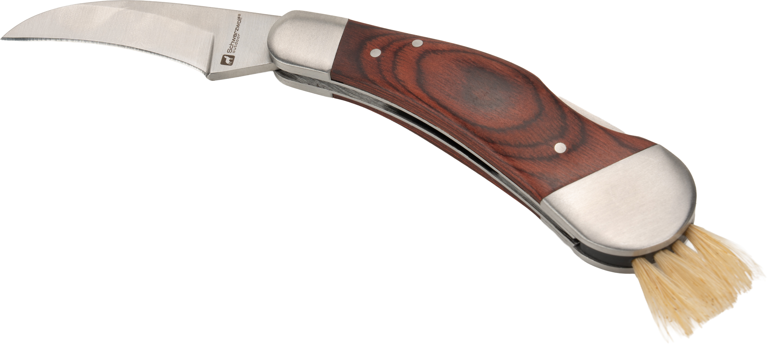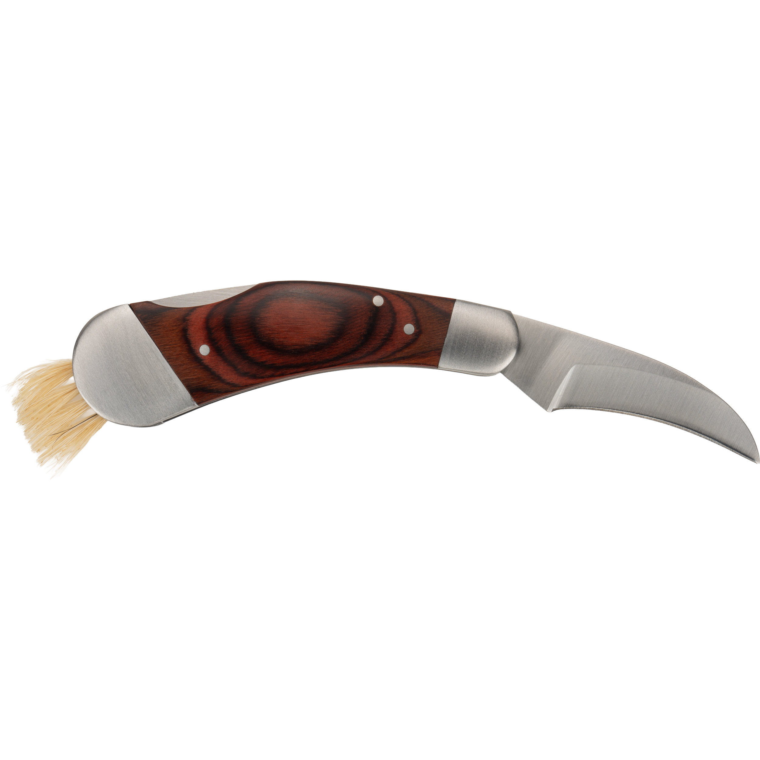 Nóż do zbierania grzybów, wykonany ze stali nierdzewnej i drewna, wyposażony w pędzelek do czyszczenia grzybów.