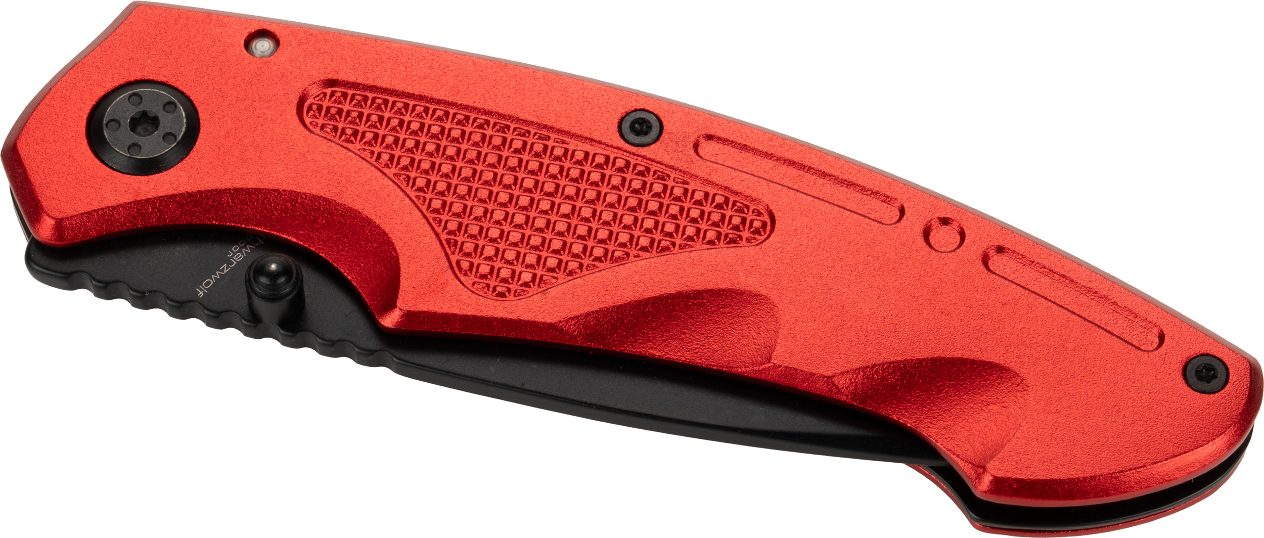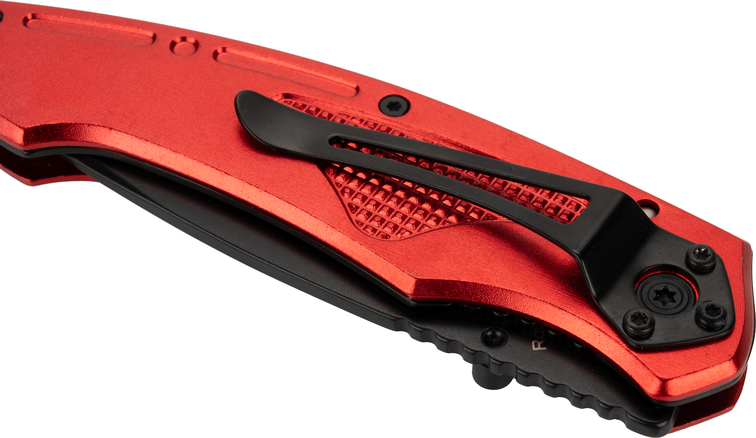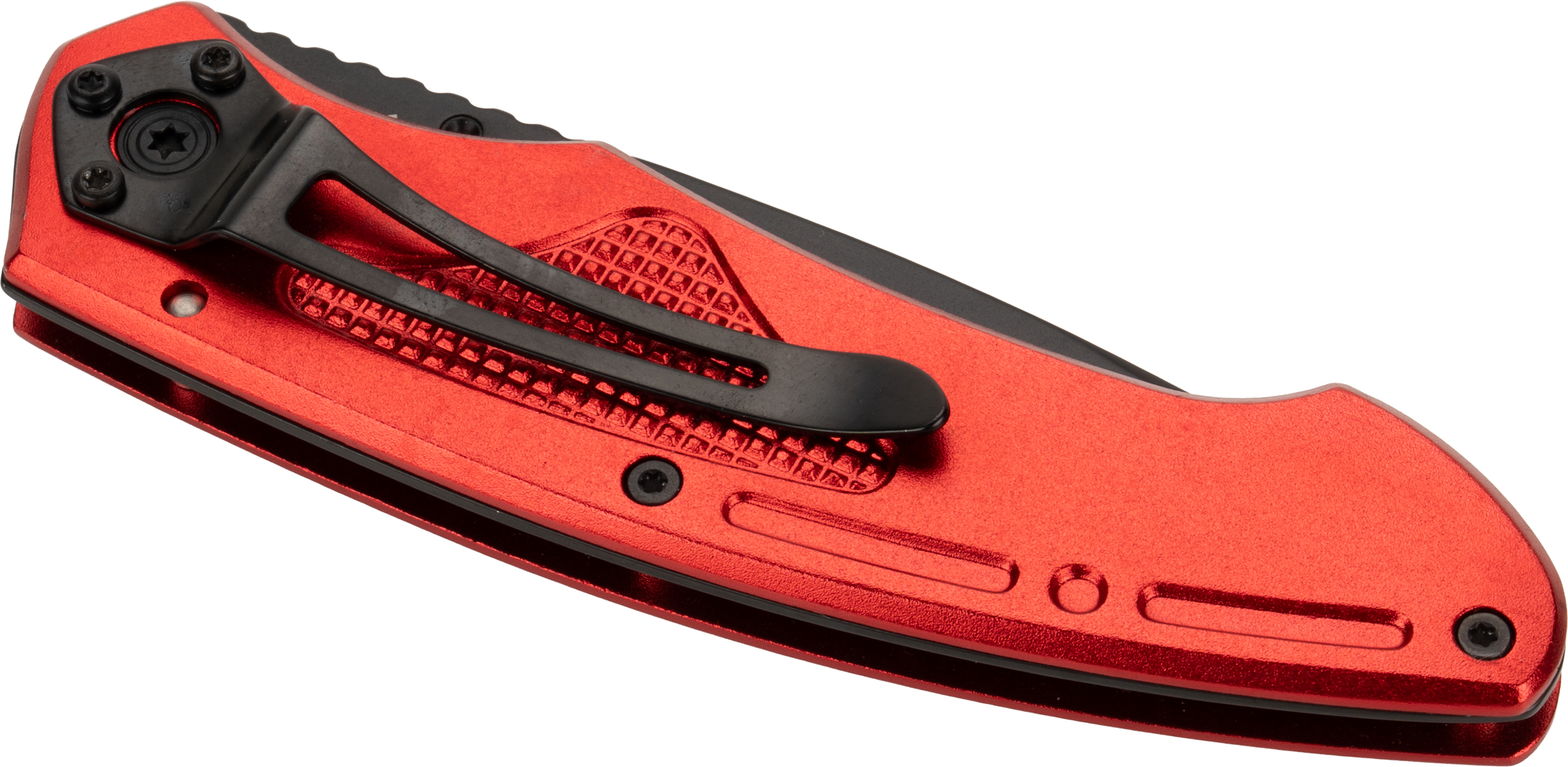 Nóż kieszonkowy wykonany ze stali nierdzewnej z aluminiową rękojeścią i klipsem do mocowania na pasku.