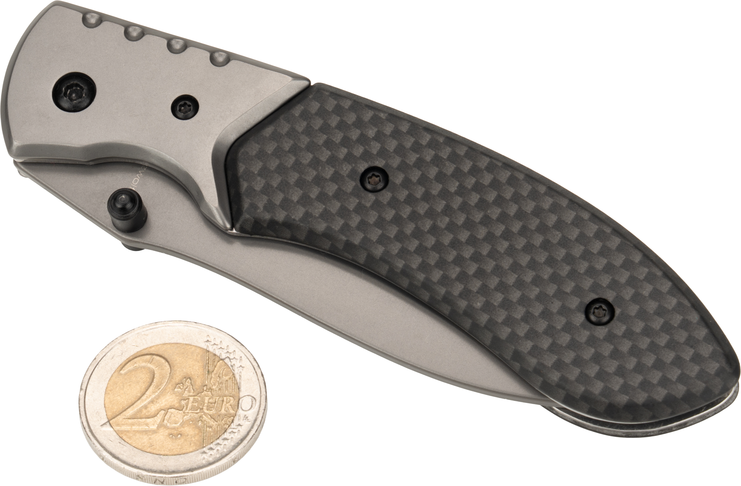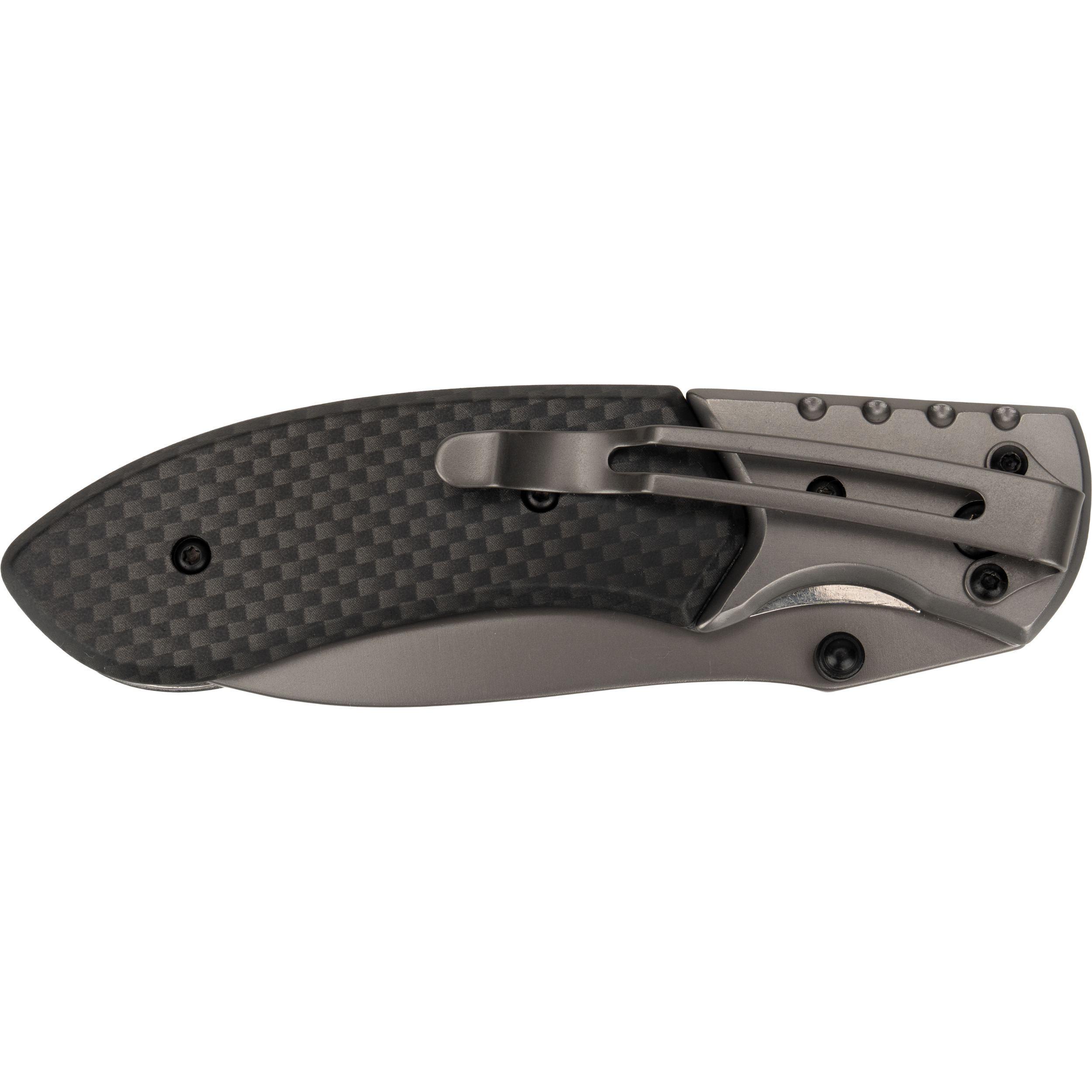 Kieszonkowy nóż ze sprzączką, wykonany z włókna węglowego i metalu.