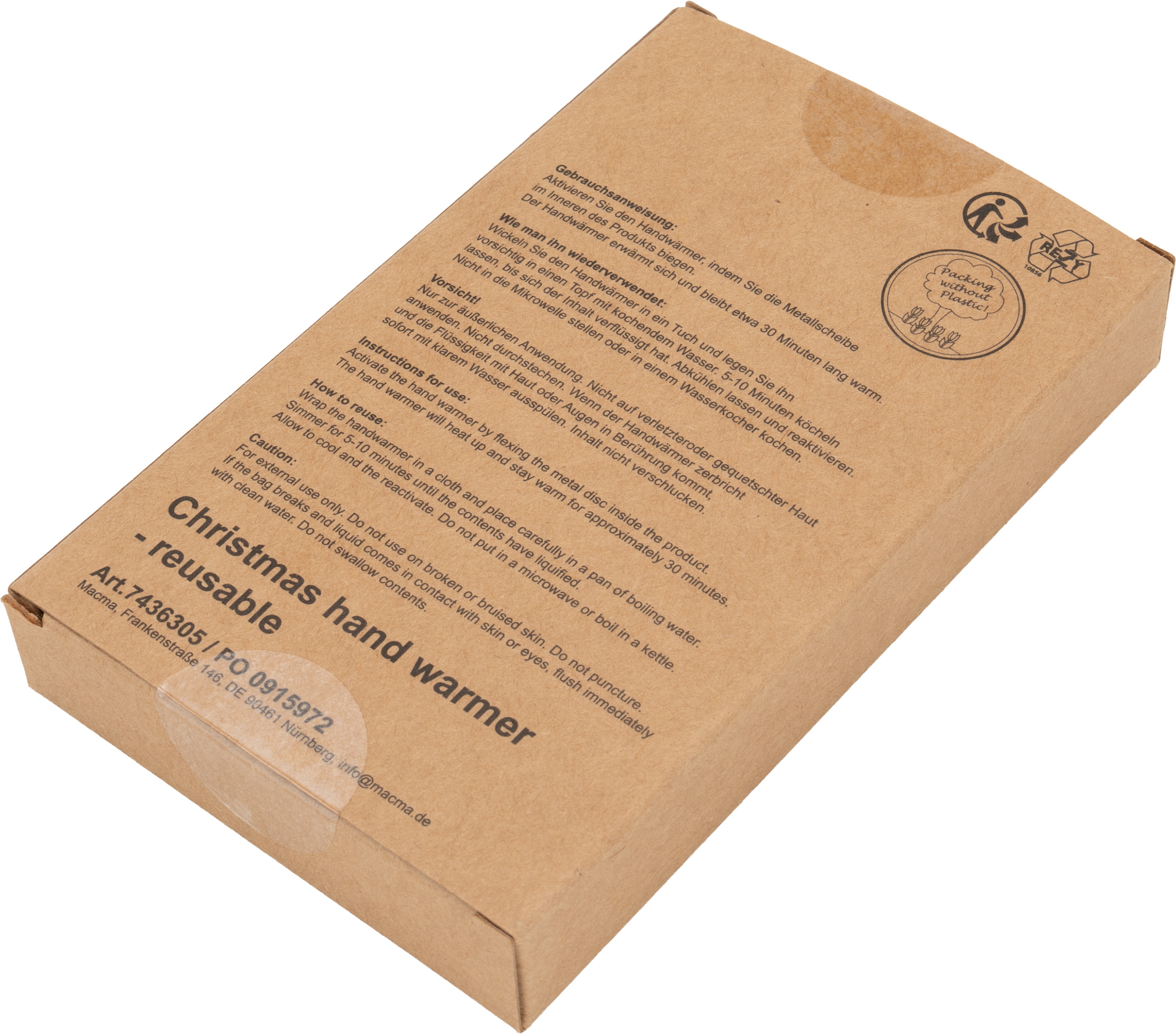 Mały ogrzewacz do rąk w pokrowcu z motywem świątecznym. Ogrzewacz aktywuje się poprzez zgięcie wewnętrznej metalowej płytki, co powoduje krystalizację płynu wewnątrz i wytwarzanie przyjemnego ciepła, czyniąc go idealnym towarzyszem na chłodne dni.