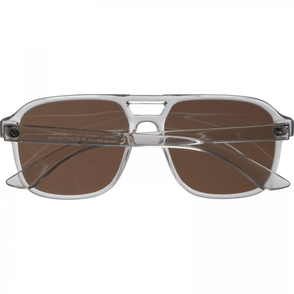 Okulary przeciwsłoneczne z przezroczystymi oprawkami i kolorowymi szkłami, wykonane z RPET. Ochrona UV400, filtr 3 kategorii.