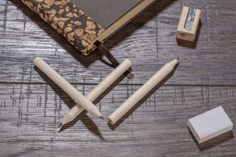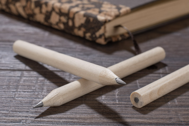 Krótki, drewniany ołówek IKKO z szeroką możliwością znakowania. Długość 8,5 cm. Ołówek zatemperowany.