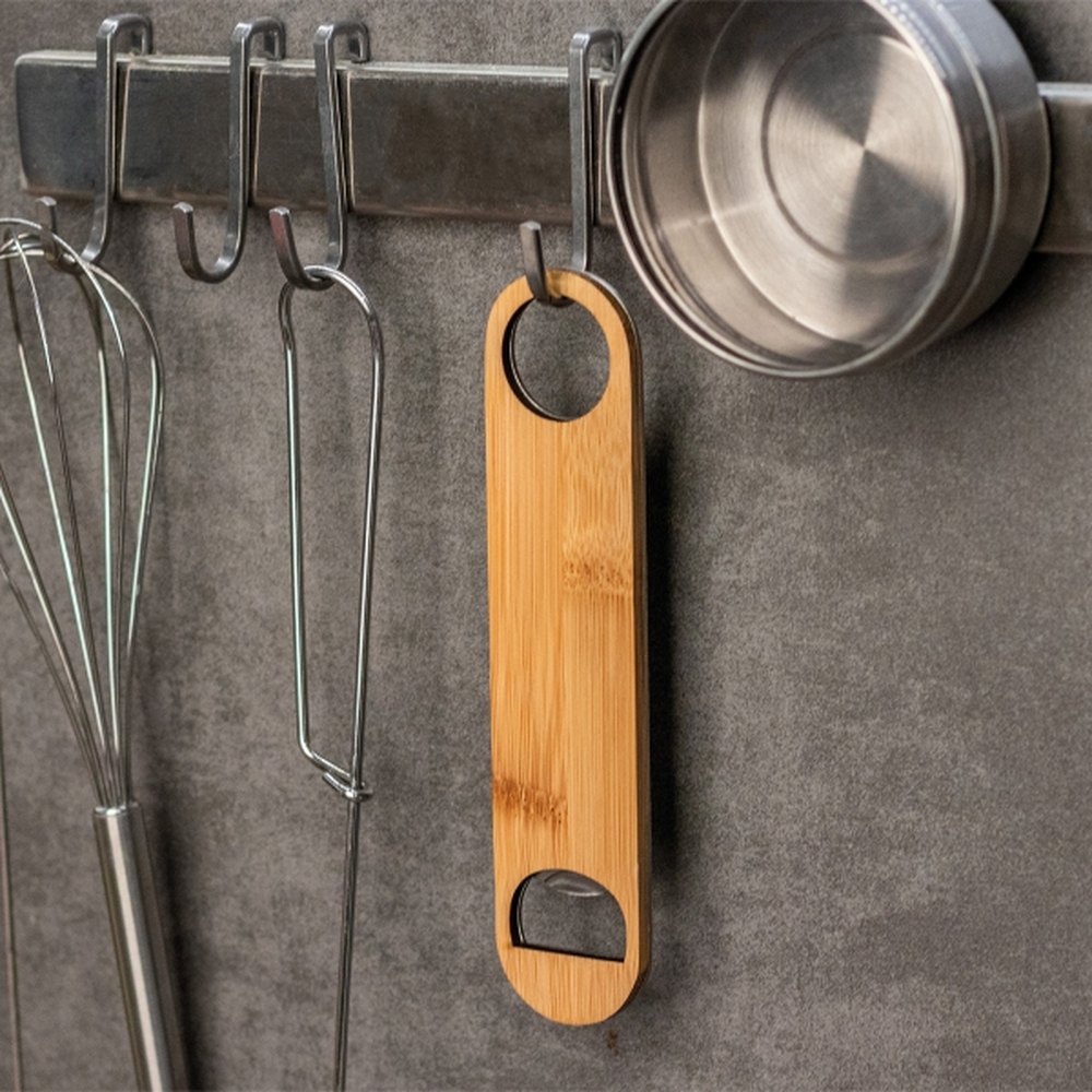 Elegancki otwieracz do butelek łączący funkcjonalność ze stylem. Wykonany ze stali nierdzewnej z elementami drewna bambusowego.
