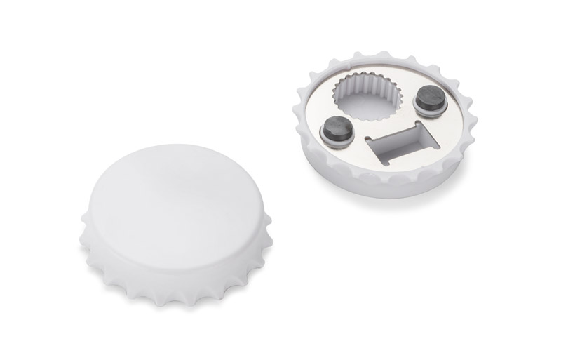 Otwieracz do butelek w kształcie kapsla. Posiada wbudowany magnes, za pomocą którego otwieracz można przymocować do lodówki. Znakowanie logo wykonujemy metodą nadruku.