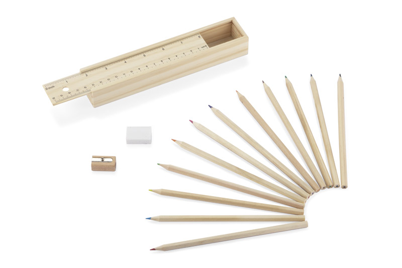 Drewniany piórnik wyposażony w dwanaście drewnianych kredek, linijkę, gumkę oraz temperówkę. Logo grawerujemy bezpośrednio na pudełku.