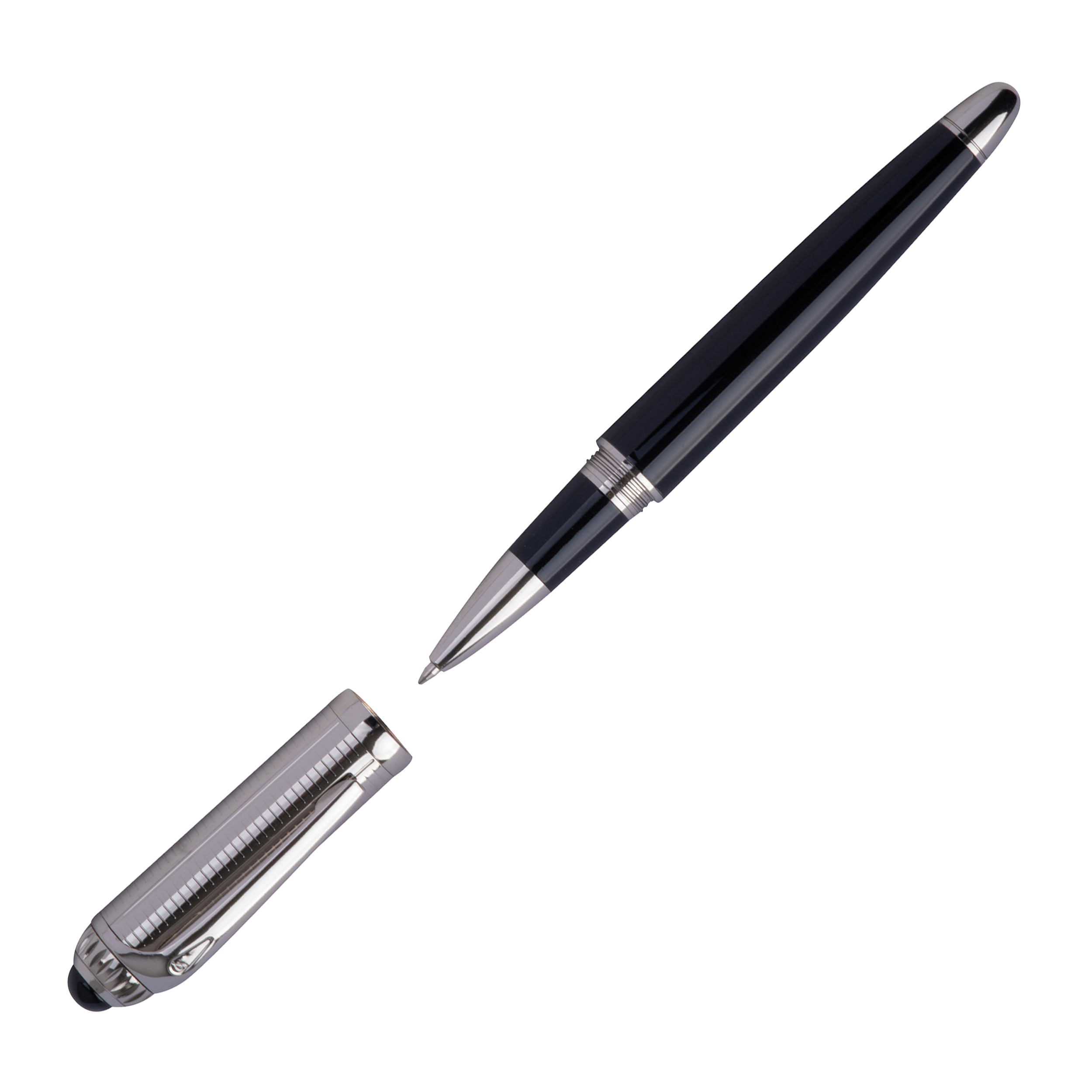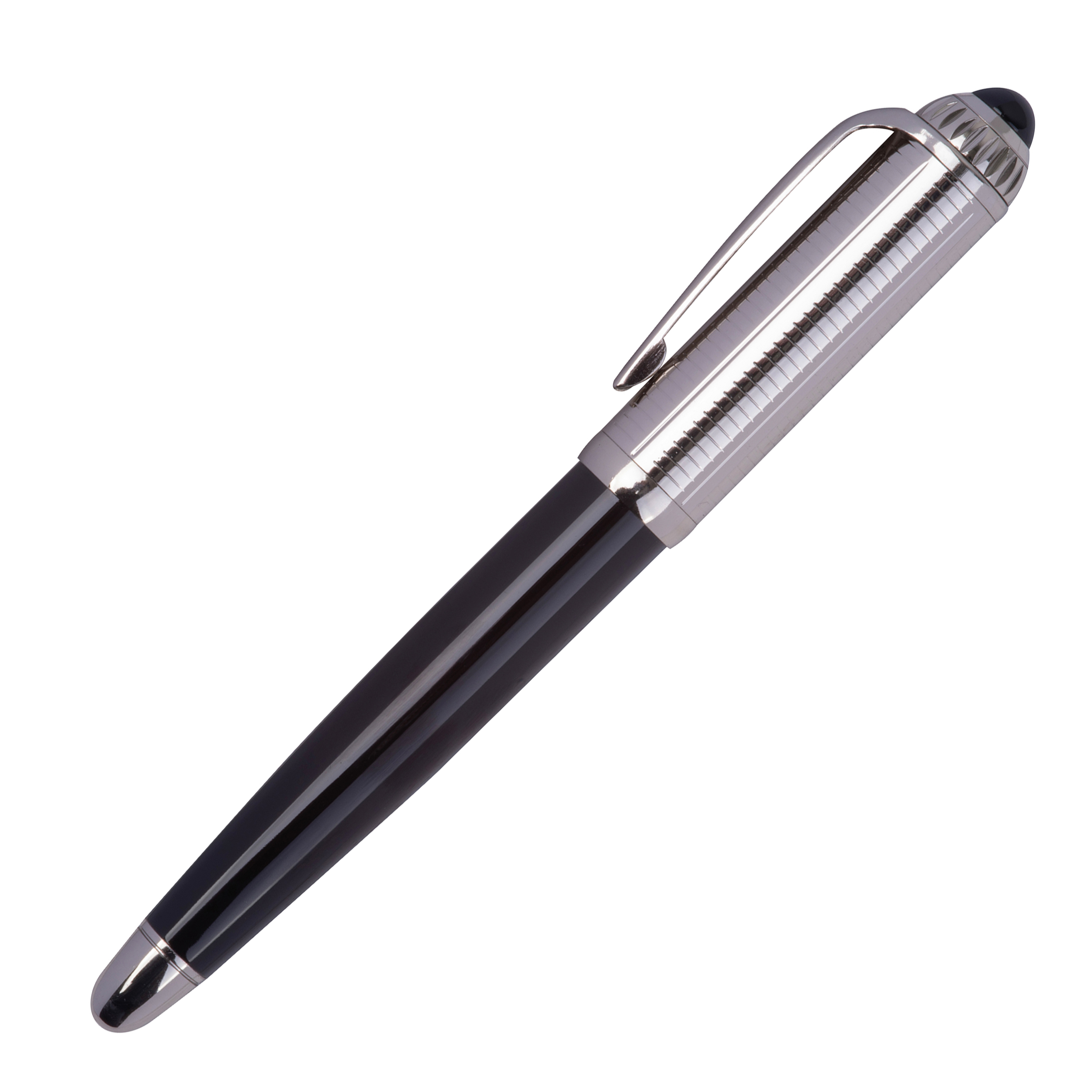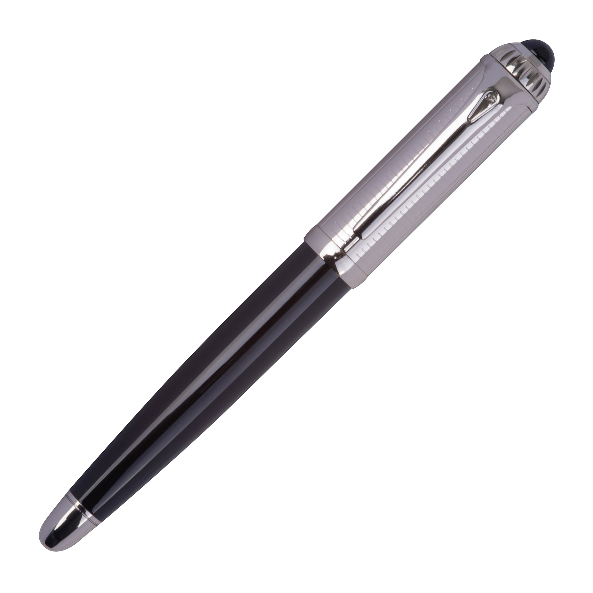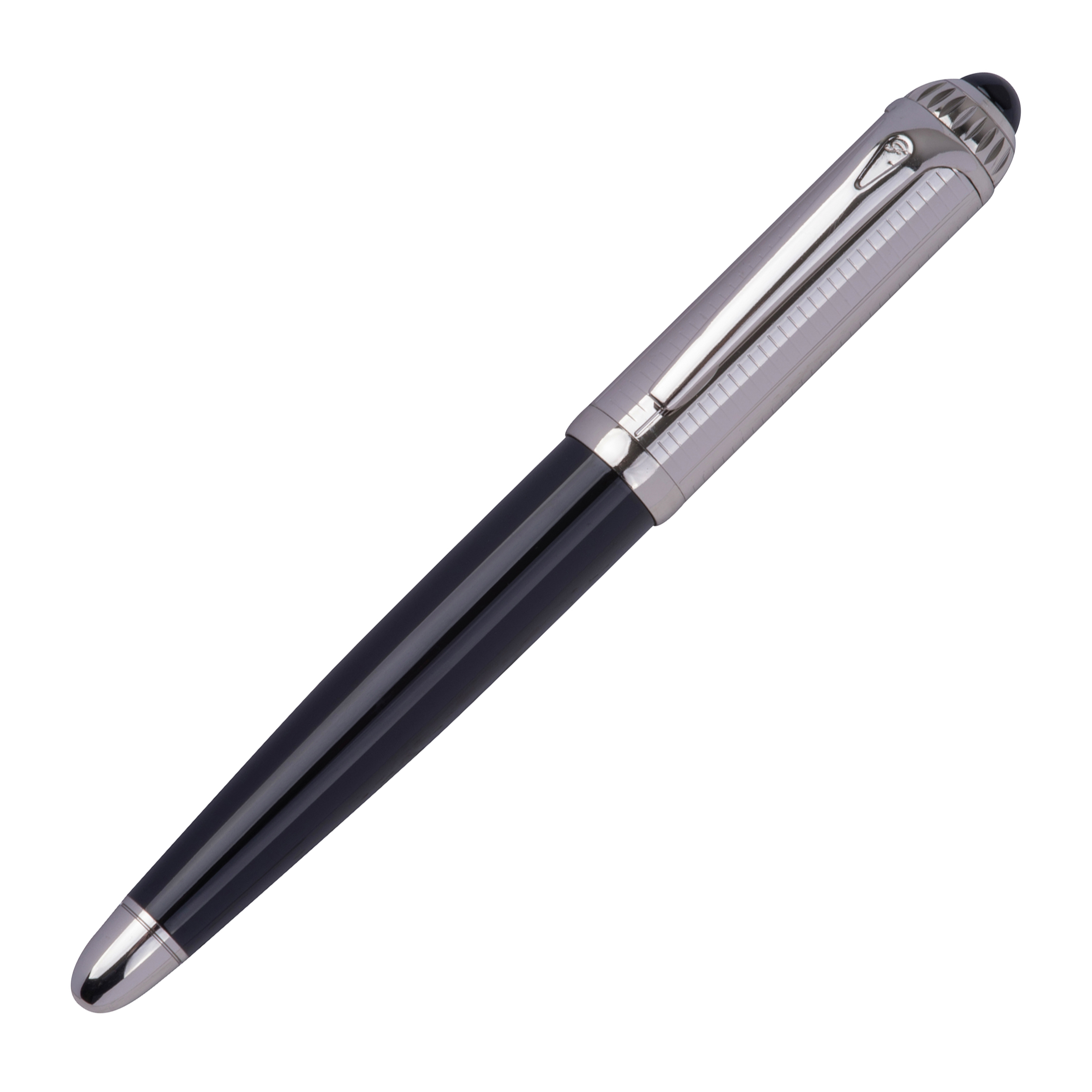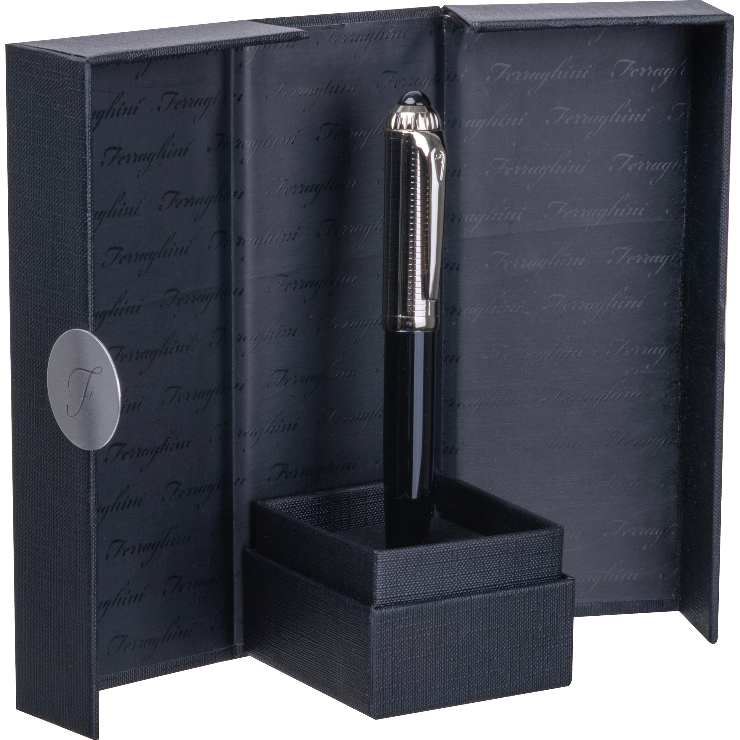 Pióro kulkowe Ferraghini z niebieskim wkładem (z zasięgiem pisania do 400m), wykonane ze stali nierdzewnej, z ozdobną skówką. Produkt zapakowany w eleganckie, dopasowane etui.