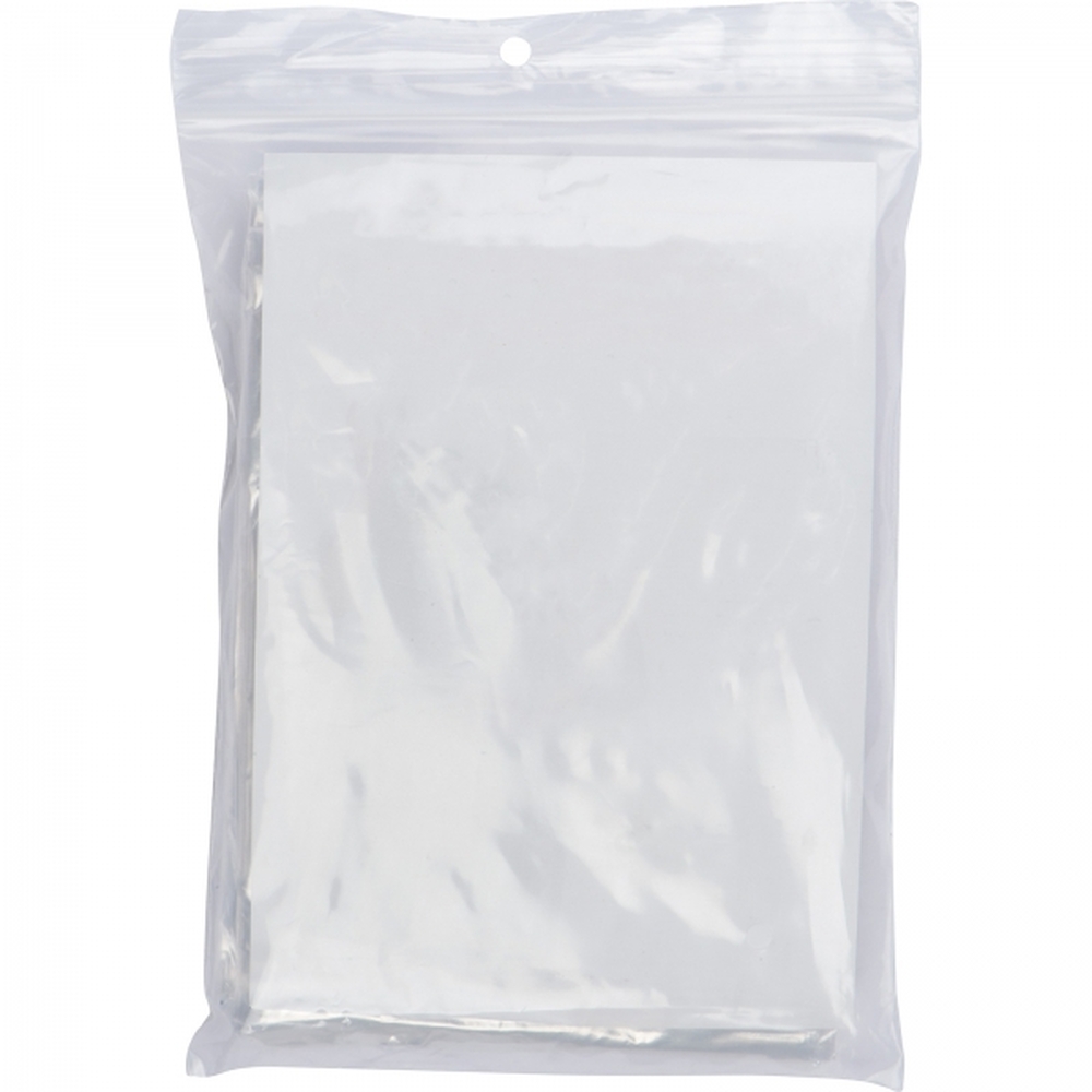 Transparentna peleryna przeciwdeszczowa w uniwersalnym rozmiarze. Plecy rozłożonego płaszcza – 115 x 110 cm, złożony – 16 x 9 cm.