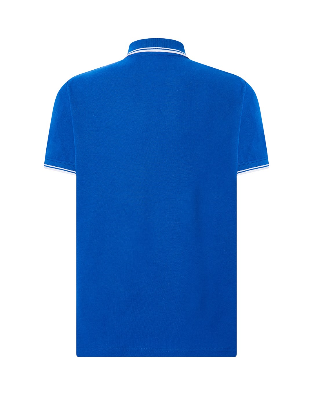 Polo męskie z krótkim rękawem. Zapinane na dwa guziki. Kołnierzyk i rękawy wykończone dzianiną 1×1. Boczne rozcięcia. 100% stabilizowana bawełna czesankowa pique.