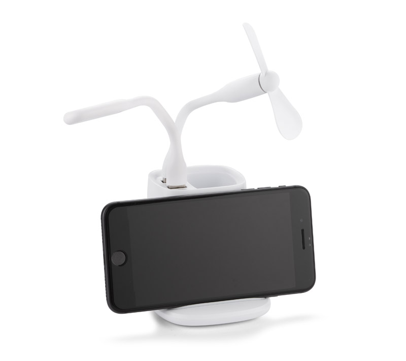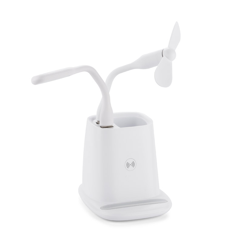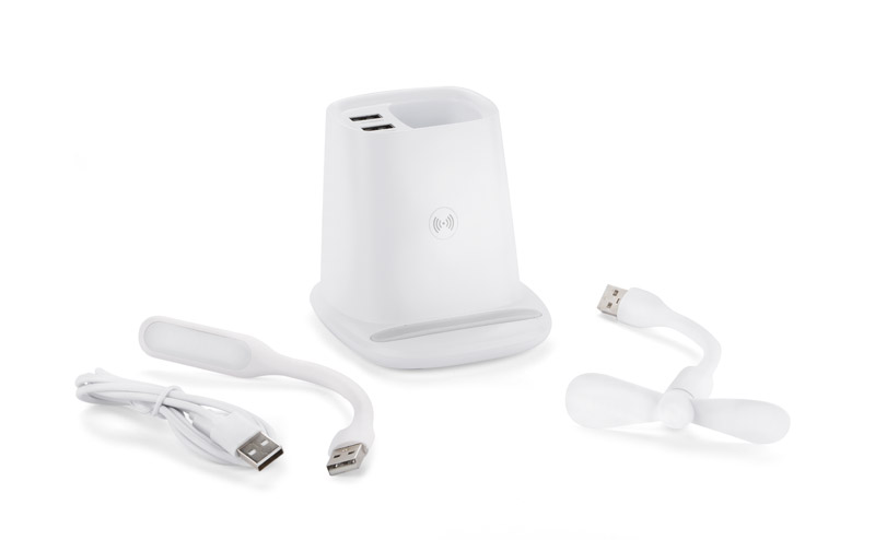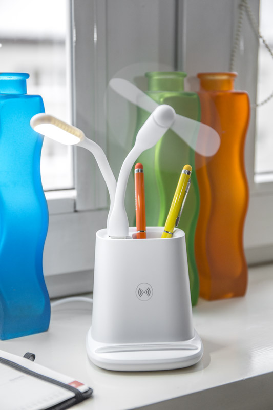 Przybornik na biurko BERGO to idealny gadżet do pracy przy biurku. Posiada on wbudowaną ładowarkę bezprzewodową, która służy również jako stojak do telefonu i dwa porty USB: USB-A który zasila dołączone do produktu akcesoria: wiatraczek i lampkę oraz USB-C, pozwalający łądować urządzenia elektroniczne. W przypadku niekorzystania z akcesoriów porty USB mogą funkcjonować jako hub. Dane techniczne: wejście USB-C: 5V/2A, wyjście ładowarki bezprzewodowej: 5W, 2 wyjścia USB: 5 V/2A (maks.)